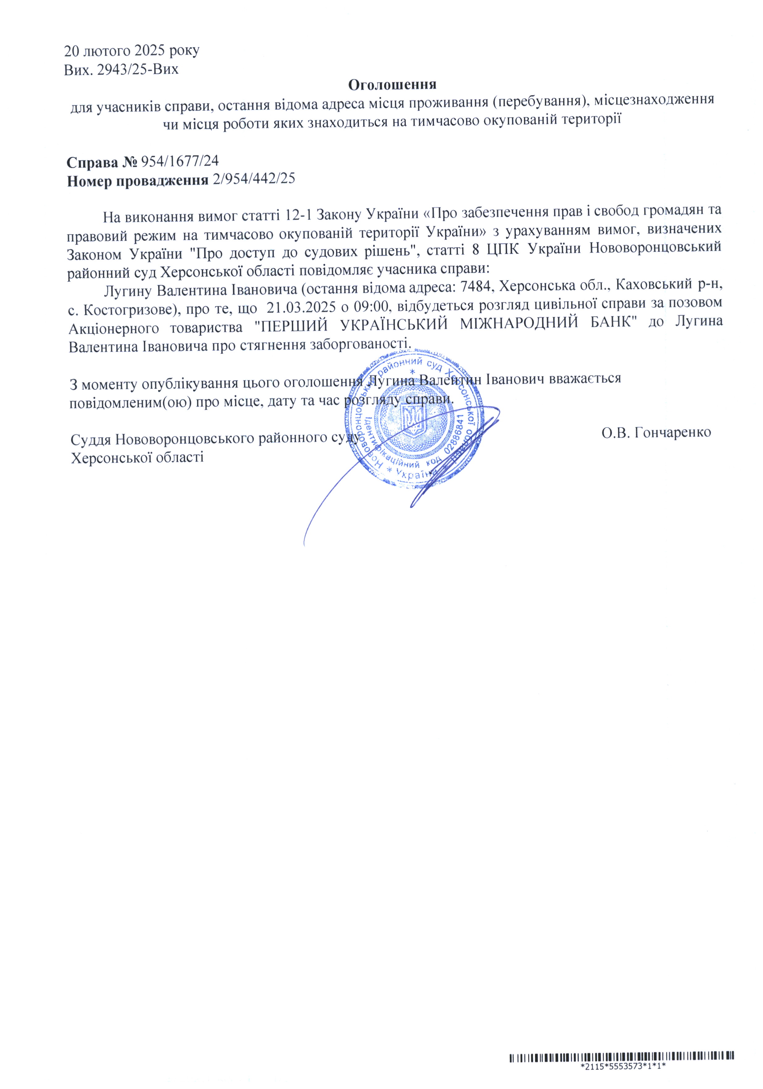 До суду викликається Лугина Валентин Іванович на 9 год. 00 хв. 21 березня 2025 року