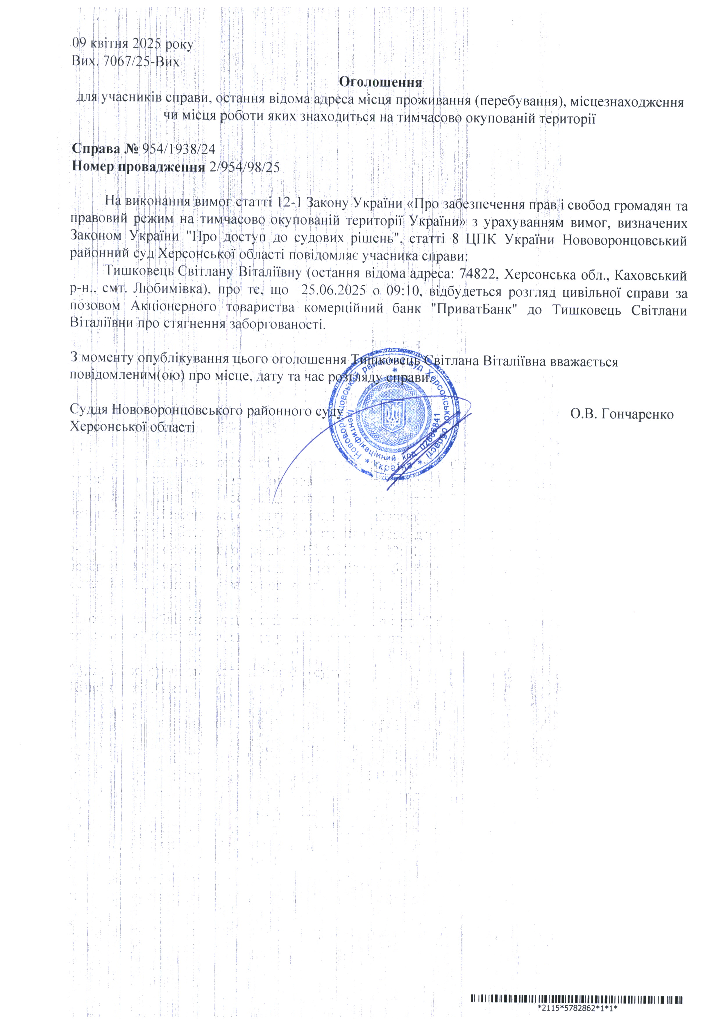 До суду викликається Тишковець Світлана Віталіївна на 9 год. 10 хв. 25 червня 2025 року