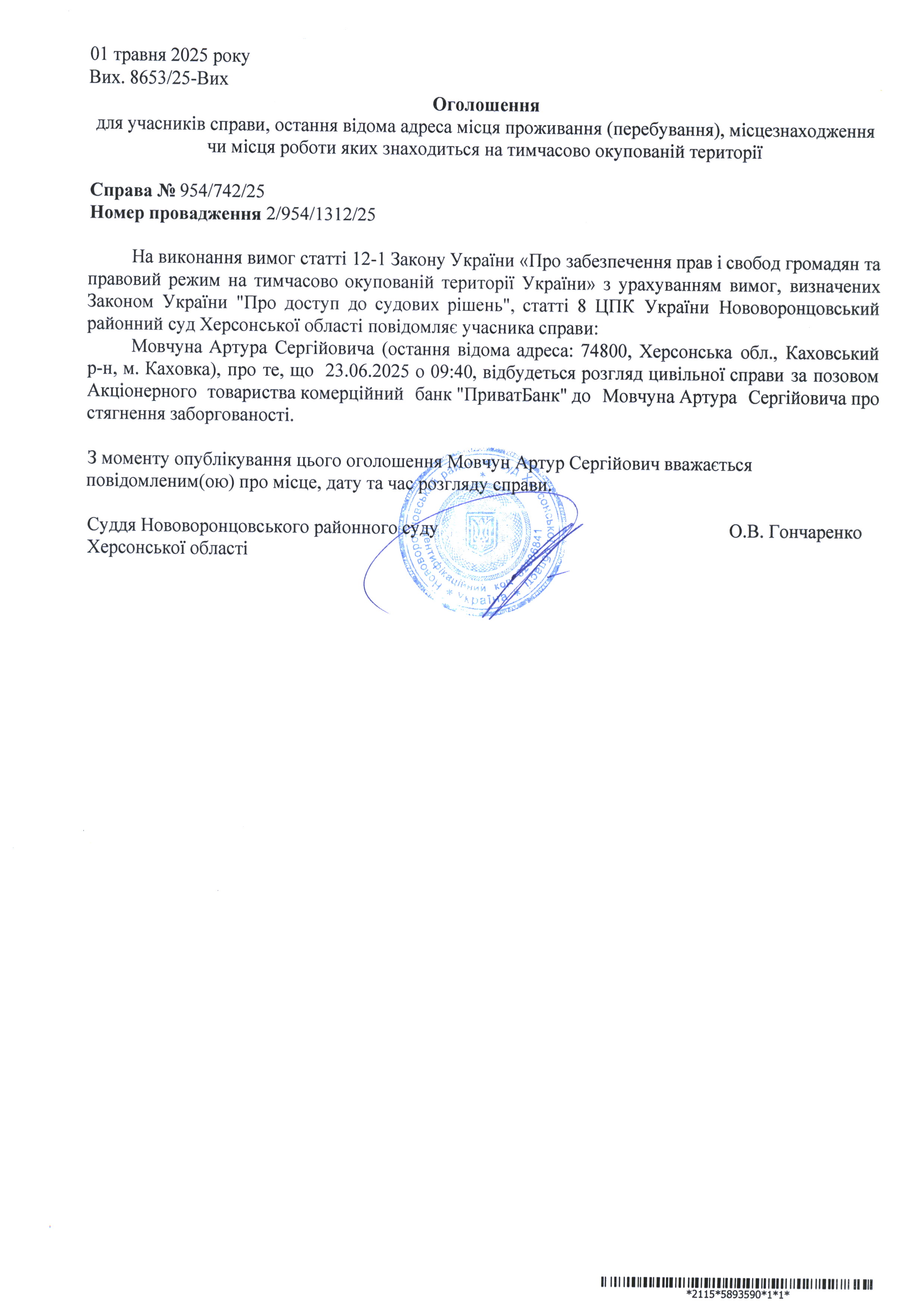 До суду викликається Мовчун Артур Сергійович на 9 год. 40 хв. 23 червня 2025 року