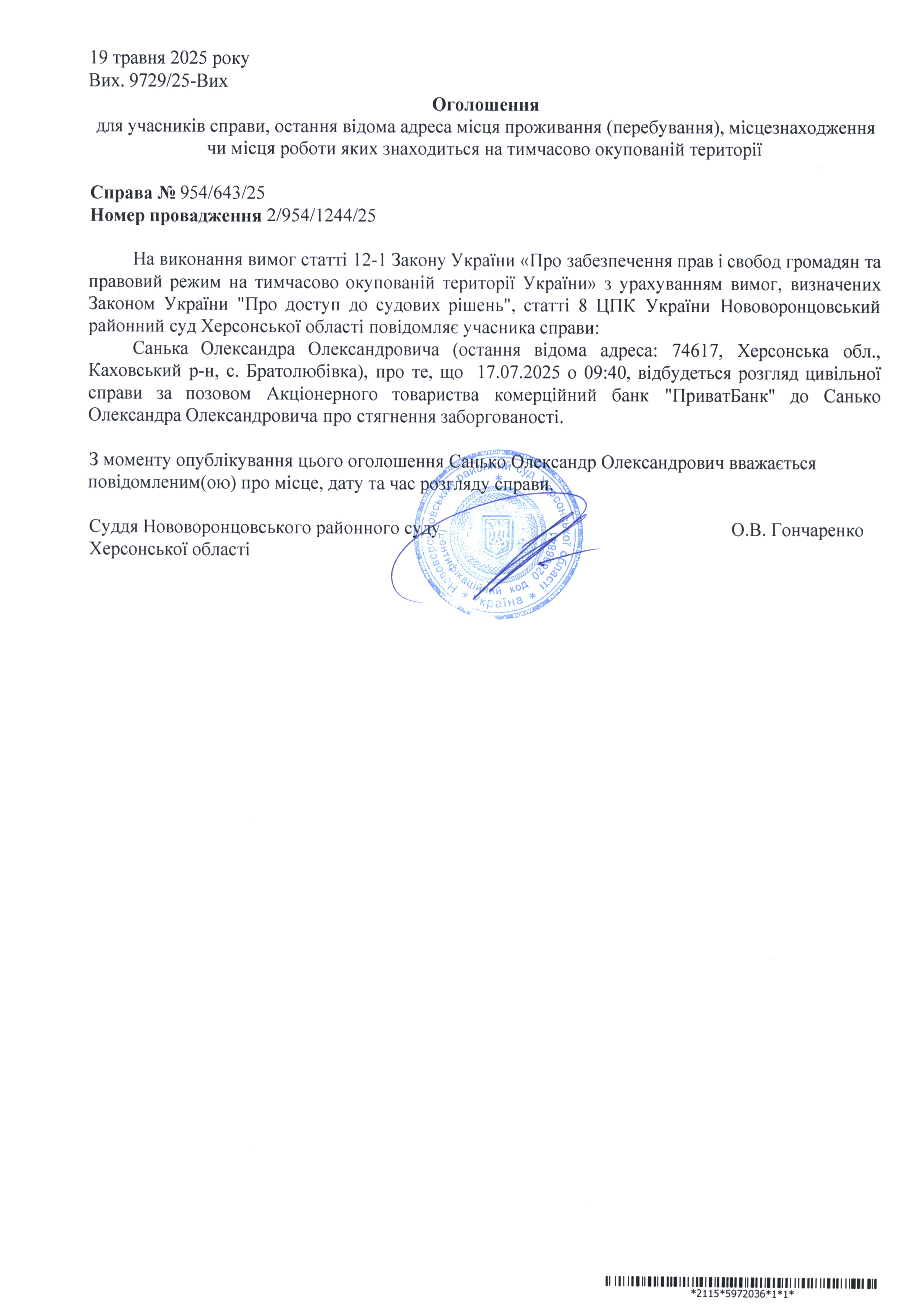 До суду викликається Санько Олександр Олександрович на 9 год. 40 хв. 17 липня 2025 року
