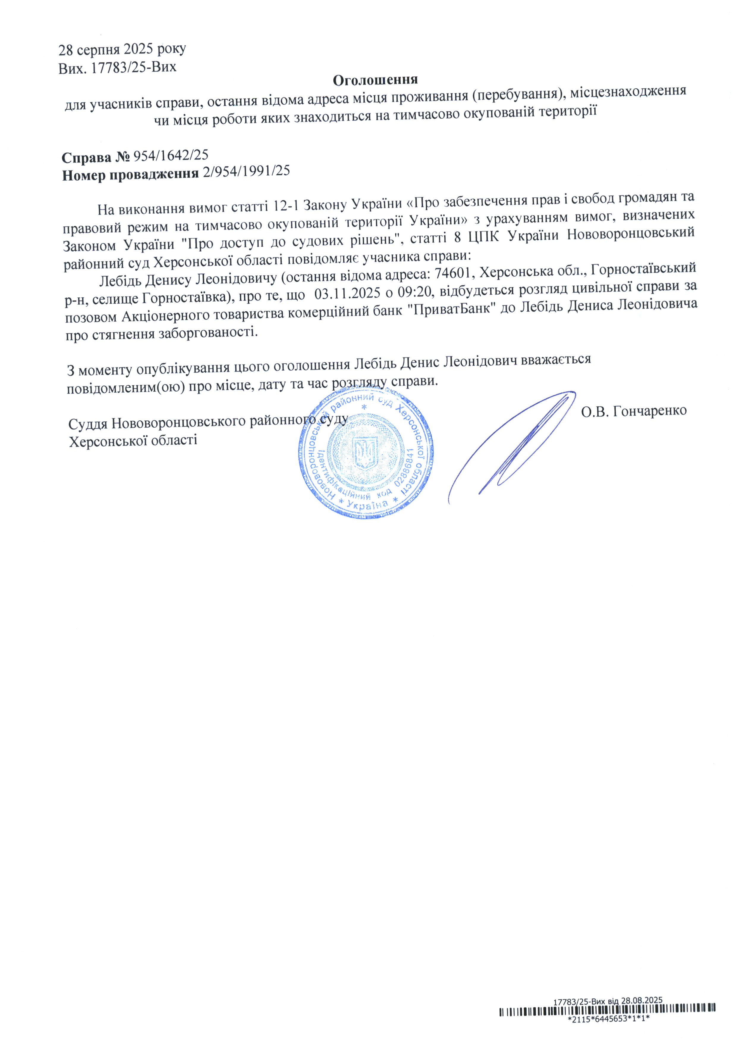 До суду викликається Лебідь Денис Леонідович на 9 год. 20 хв. 3 листопада 2025 року