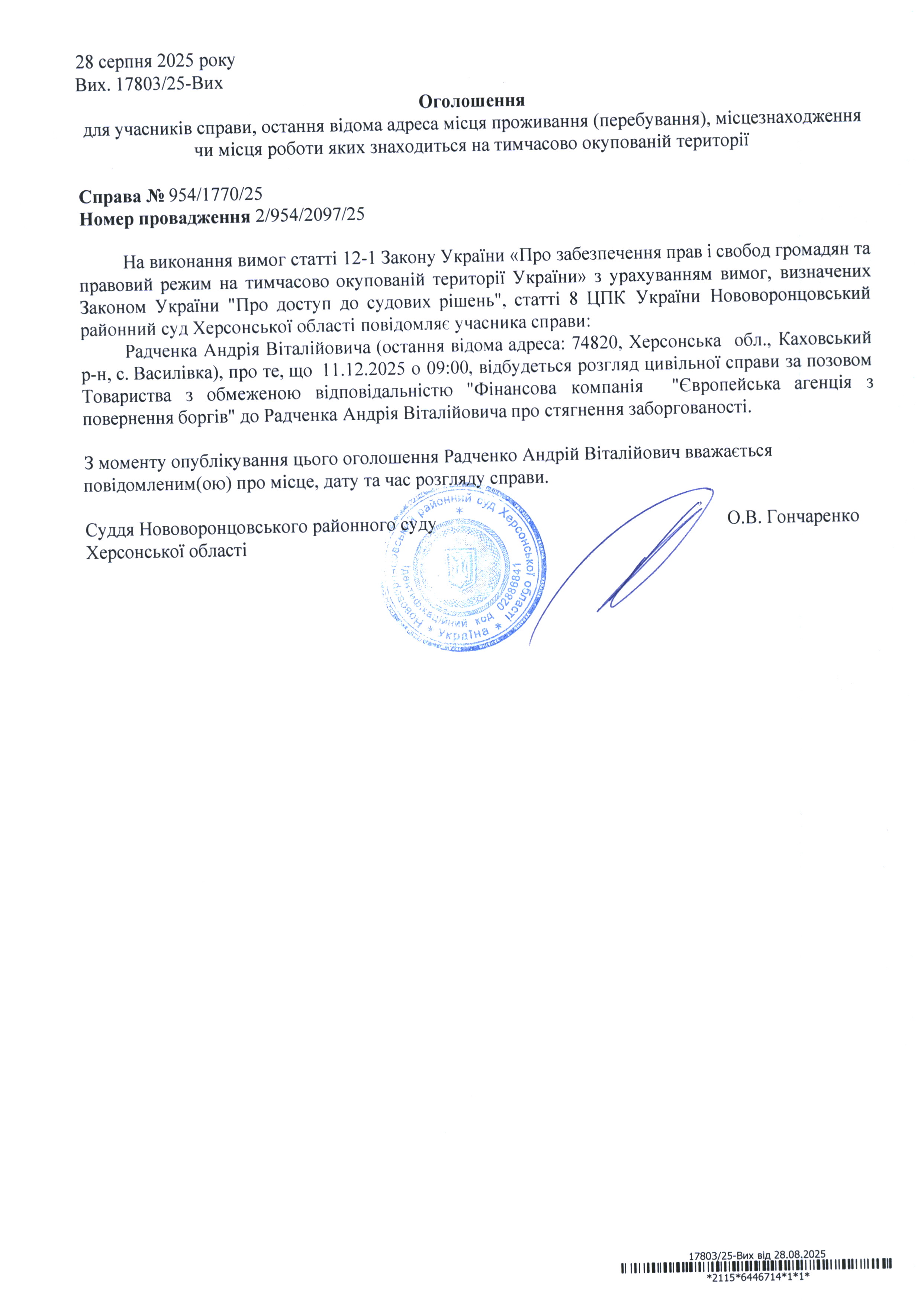 До суду викликається Радченко Андрій Віталійович на 9 год. 20 хв. 11 грудня 2025 року
