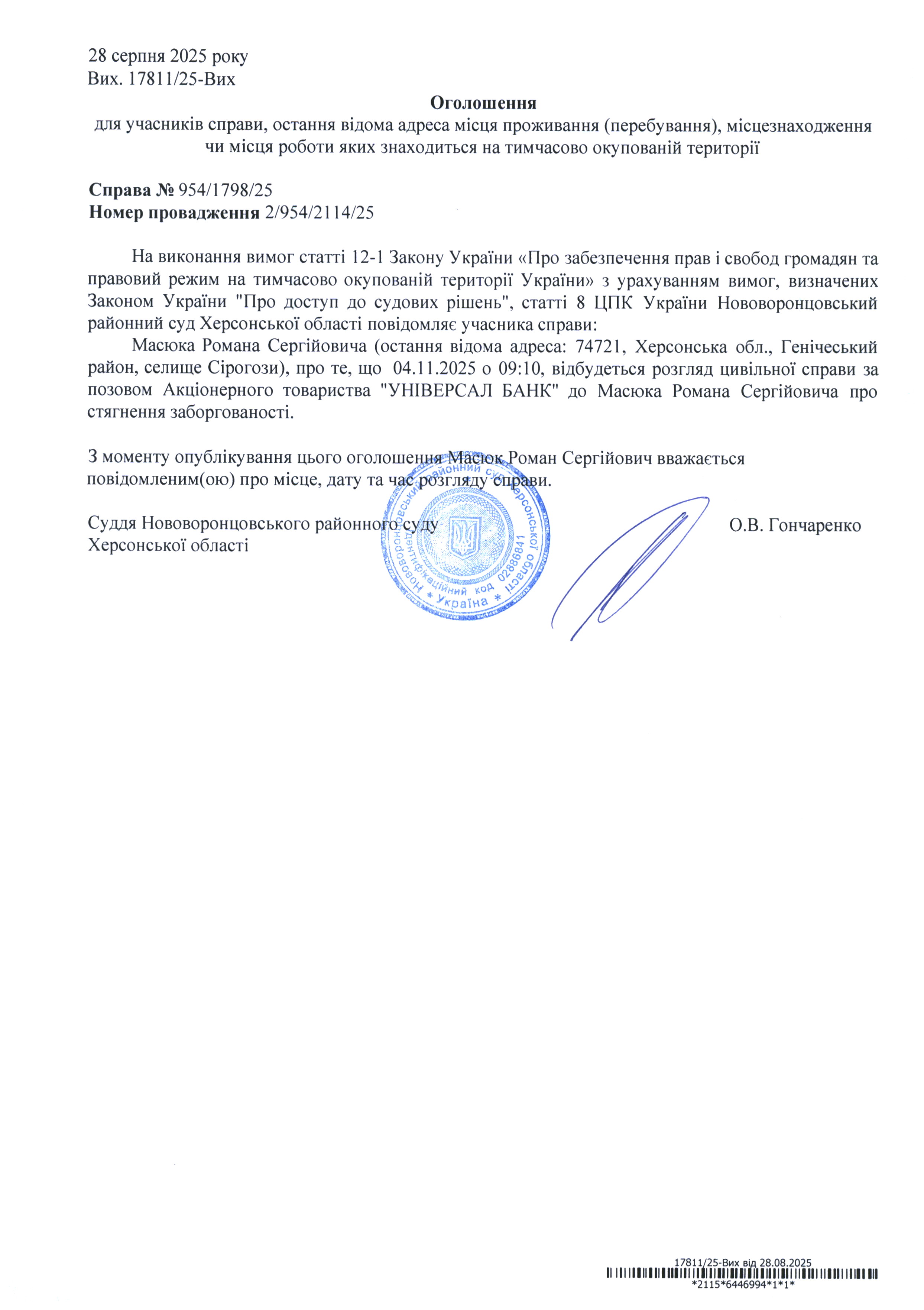 До суду викликається Масюк Роман Сергійович на 9 год. 10 хв. 4 листопада 2025 року