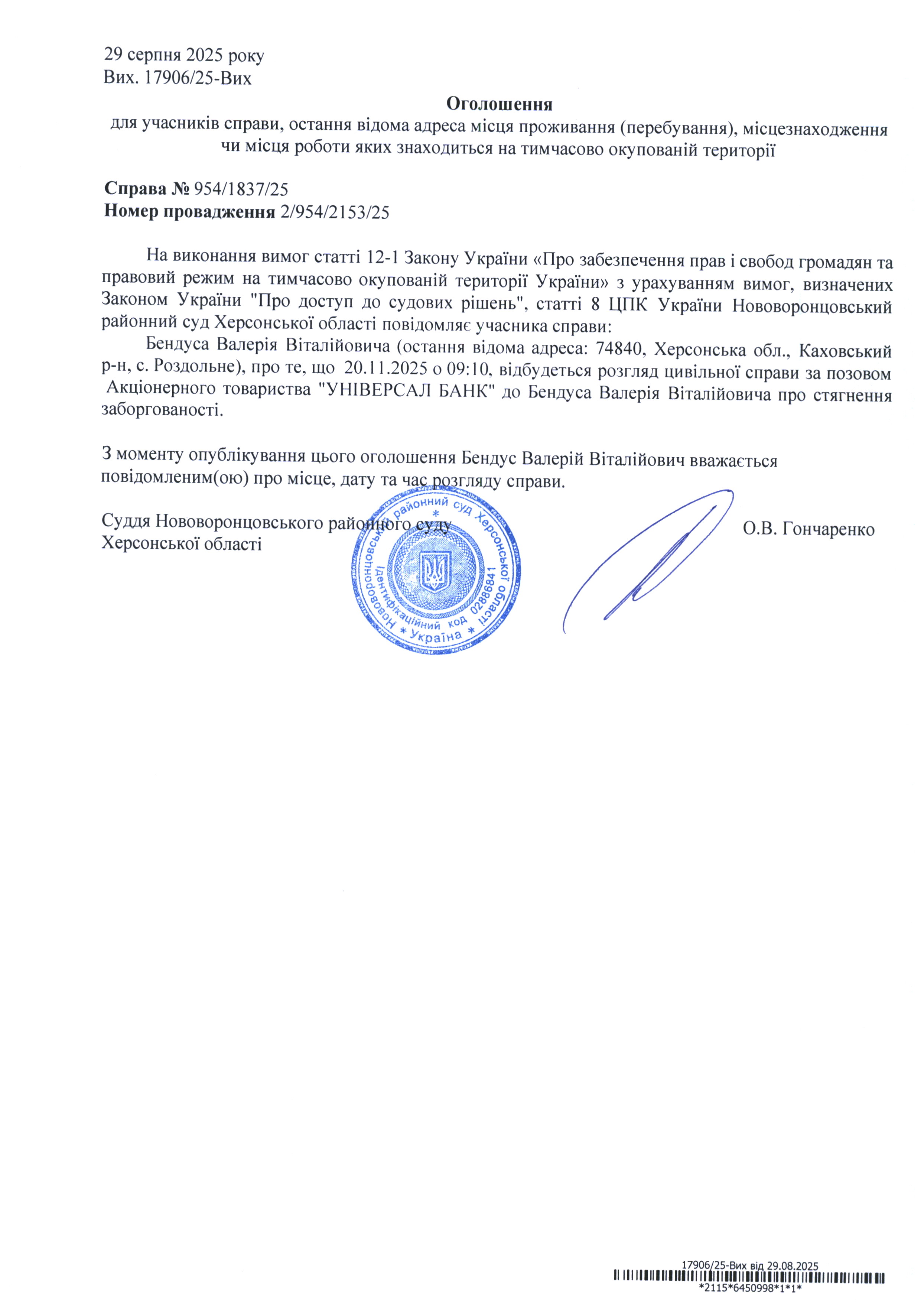До суду викликається Бендус Валерій Віталійович на 9 год. 10 хв. 20 листопада 2025 року