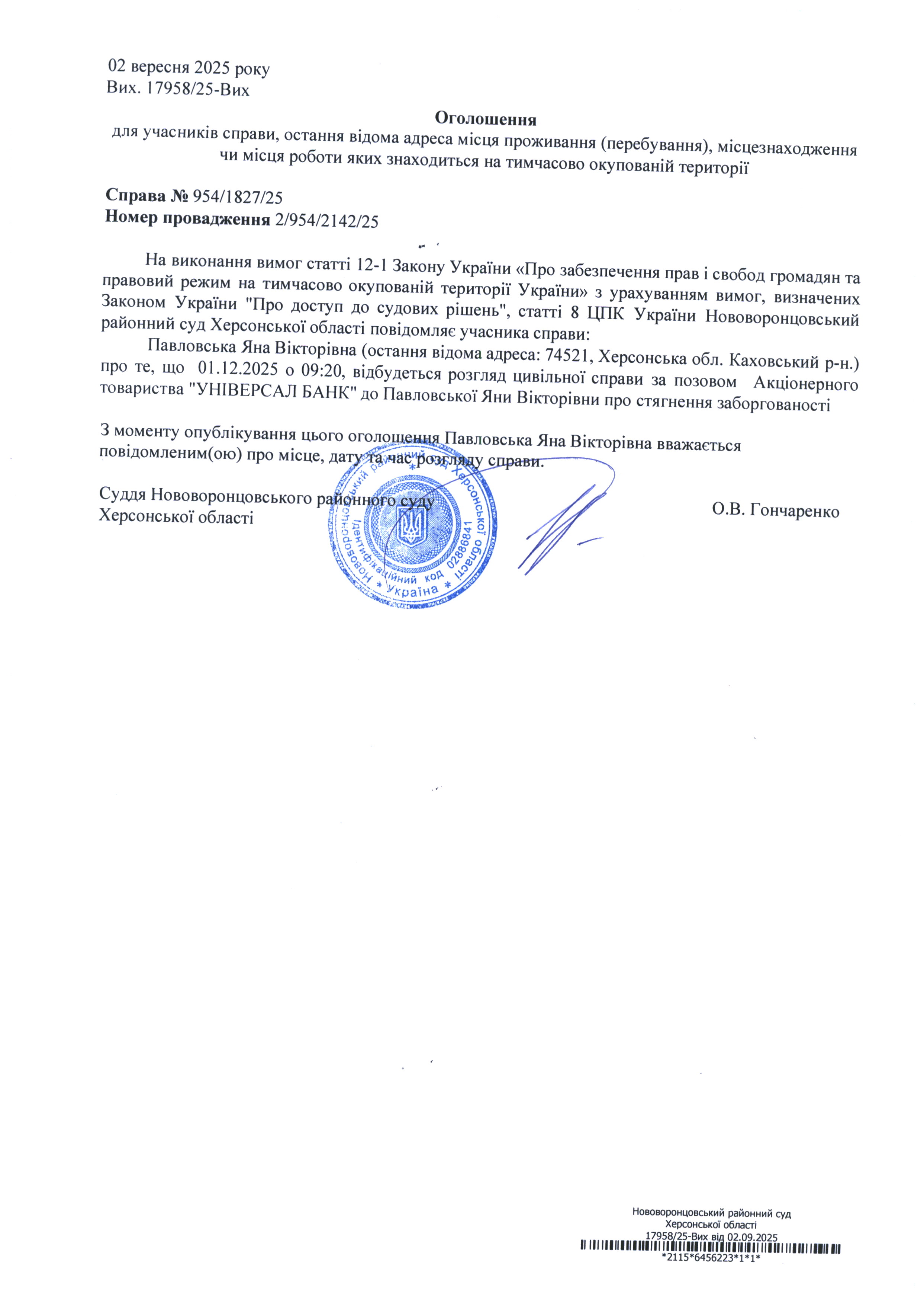 До суду викликається Павловська Яна Вікторівна на 9 год. 20 хв. 1 грудня 2025 року