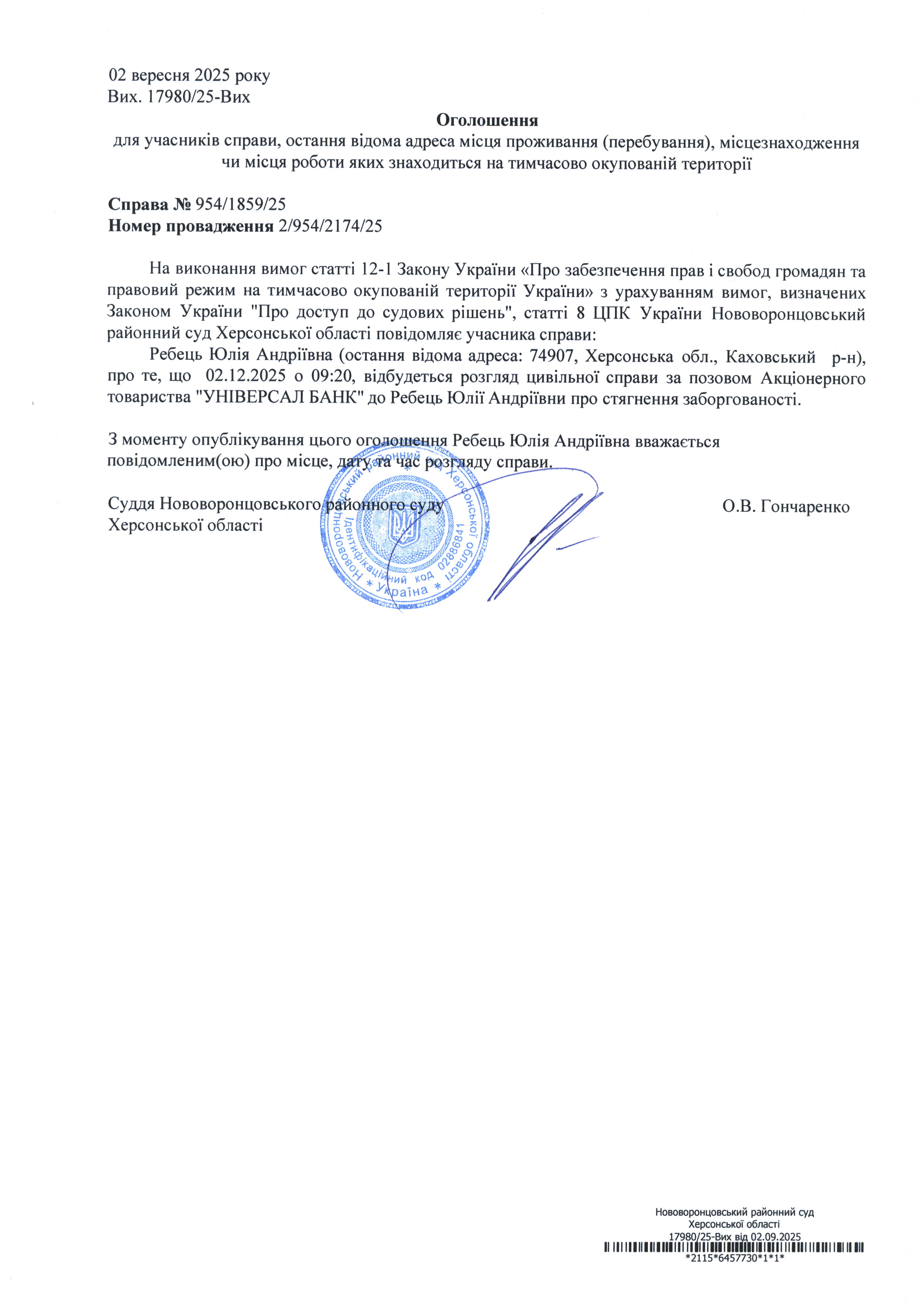 До суду викликається Ребець Юлія Андріївна на 9 год. 20 хв. 2 грудня 2025 року