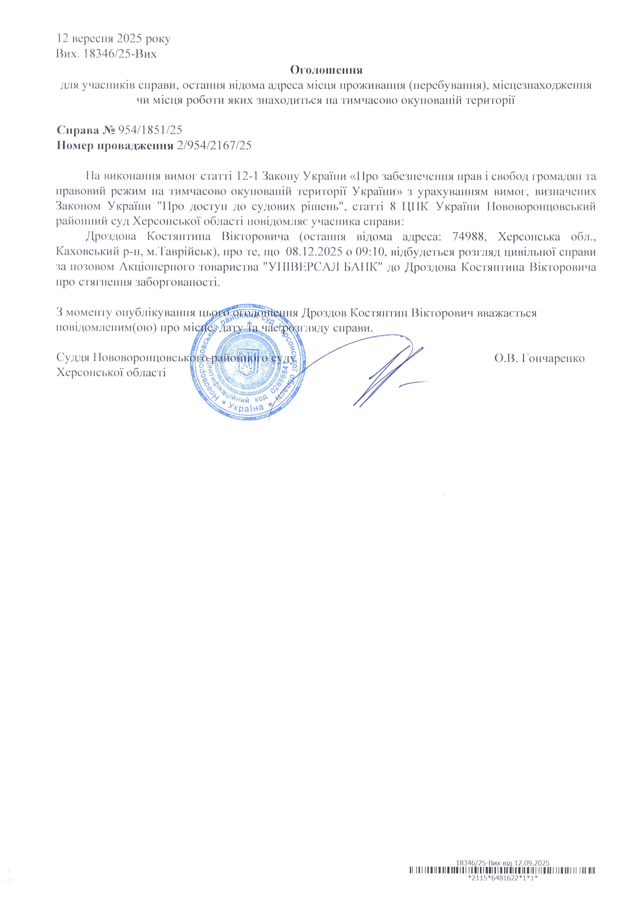 До суду викликається Дроздов Костянтин Вікторович на 9 год. 10 хв. 8 грудня 2025 року