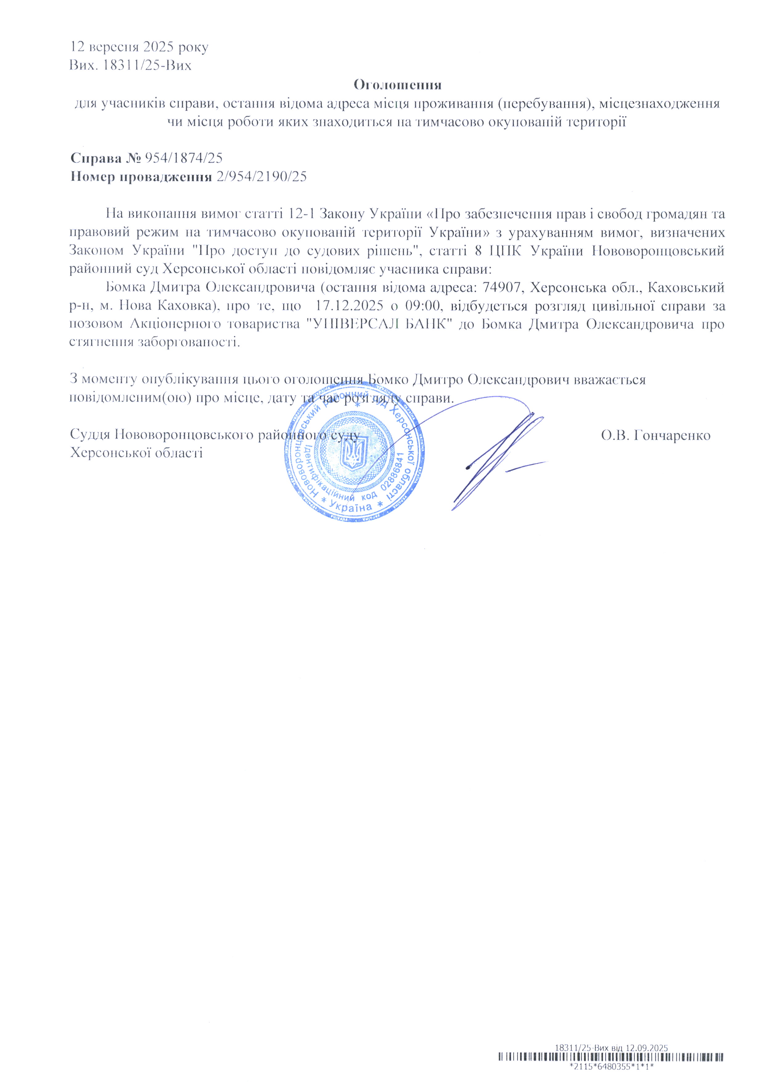 До суду викликається Бомко Дмитро Олександрович на 9 год. 00 хв. 17 грудня 2025 року