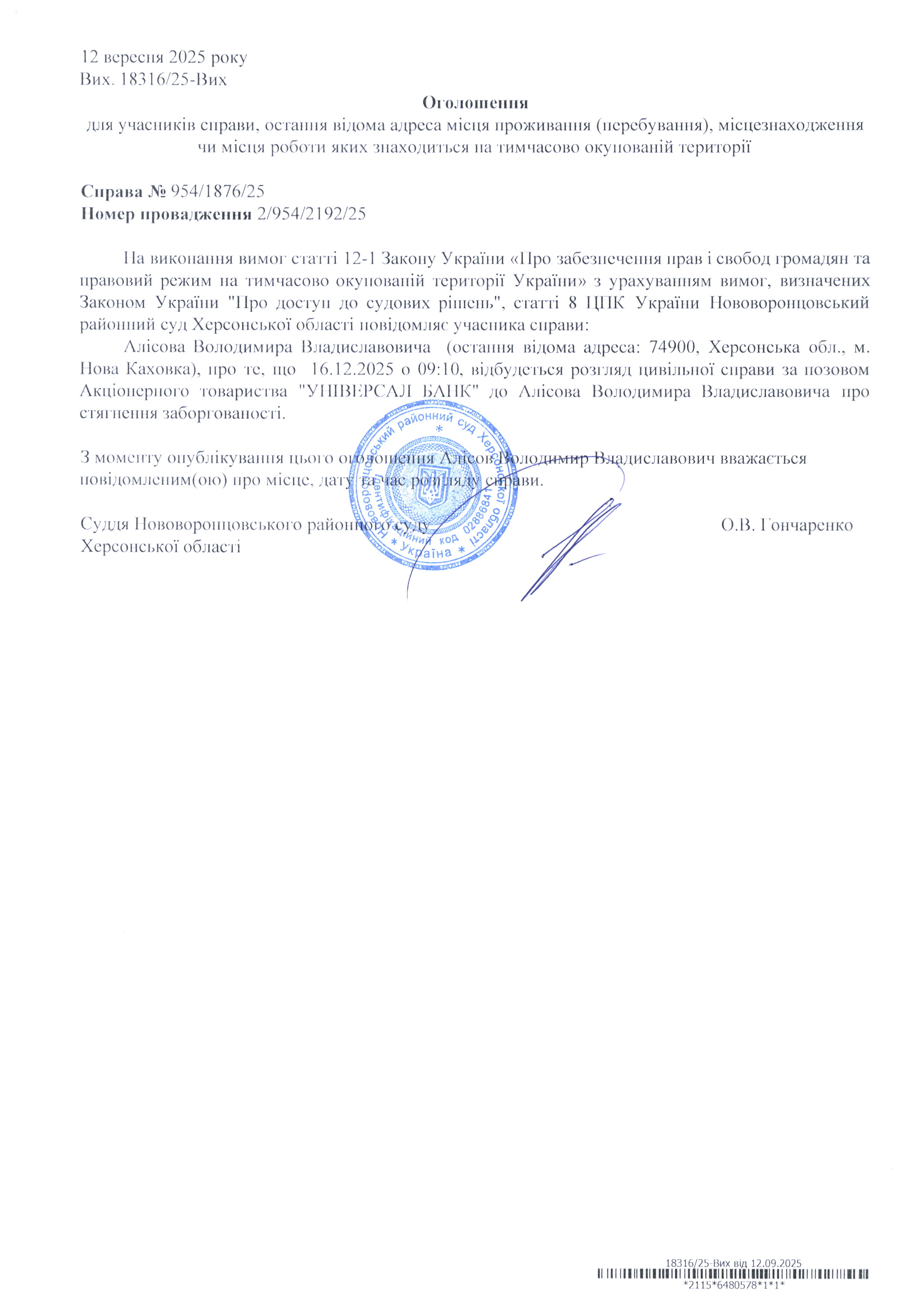 До суду викликається Алісов Володимир Владиславович на 9 год. 10 хв. 16 грудня 2025 року
