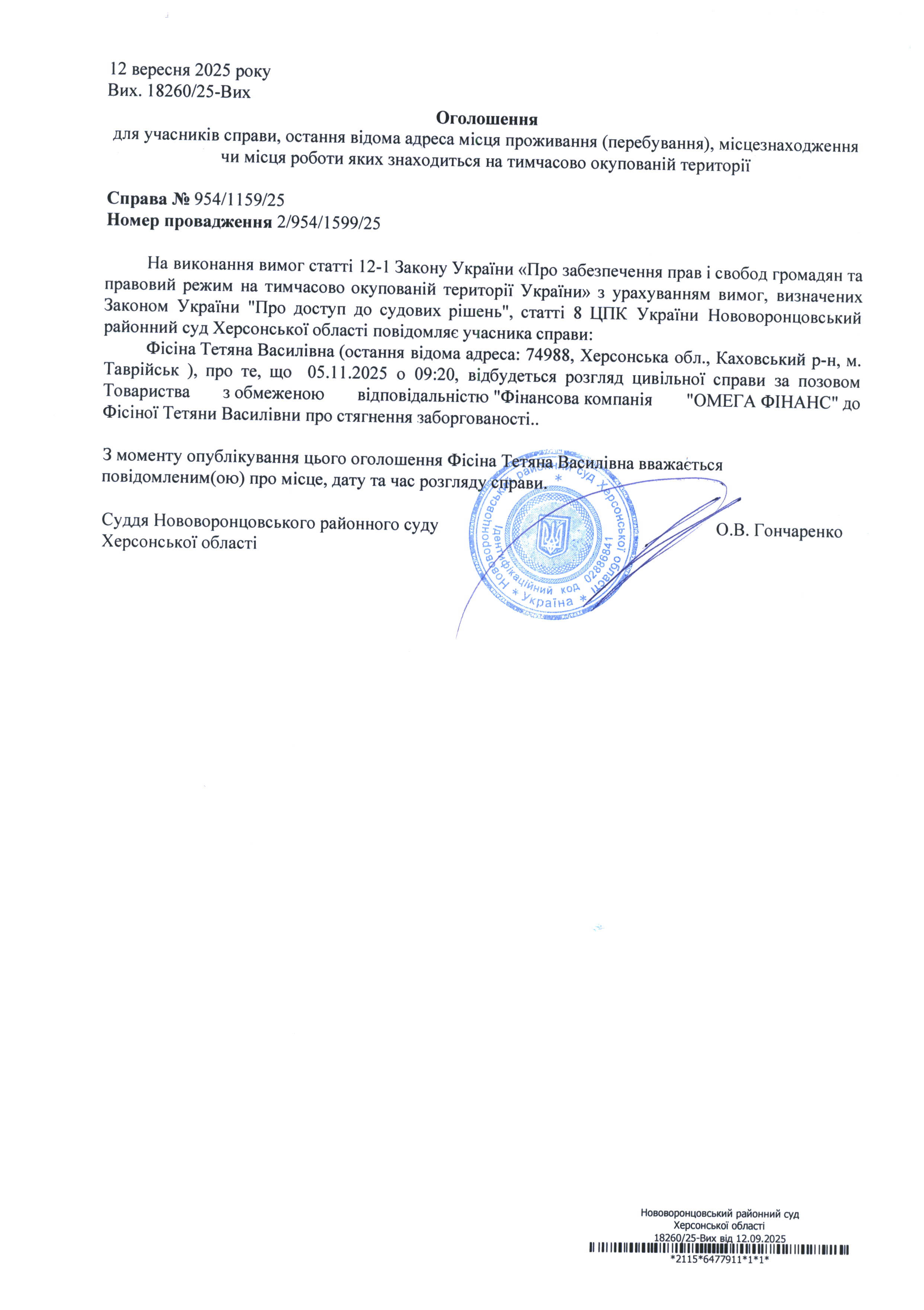 До суду викликається Фісіна Тетяна Василівна на 9 год. 20 хв. 5 листопада 2025 року