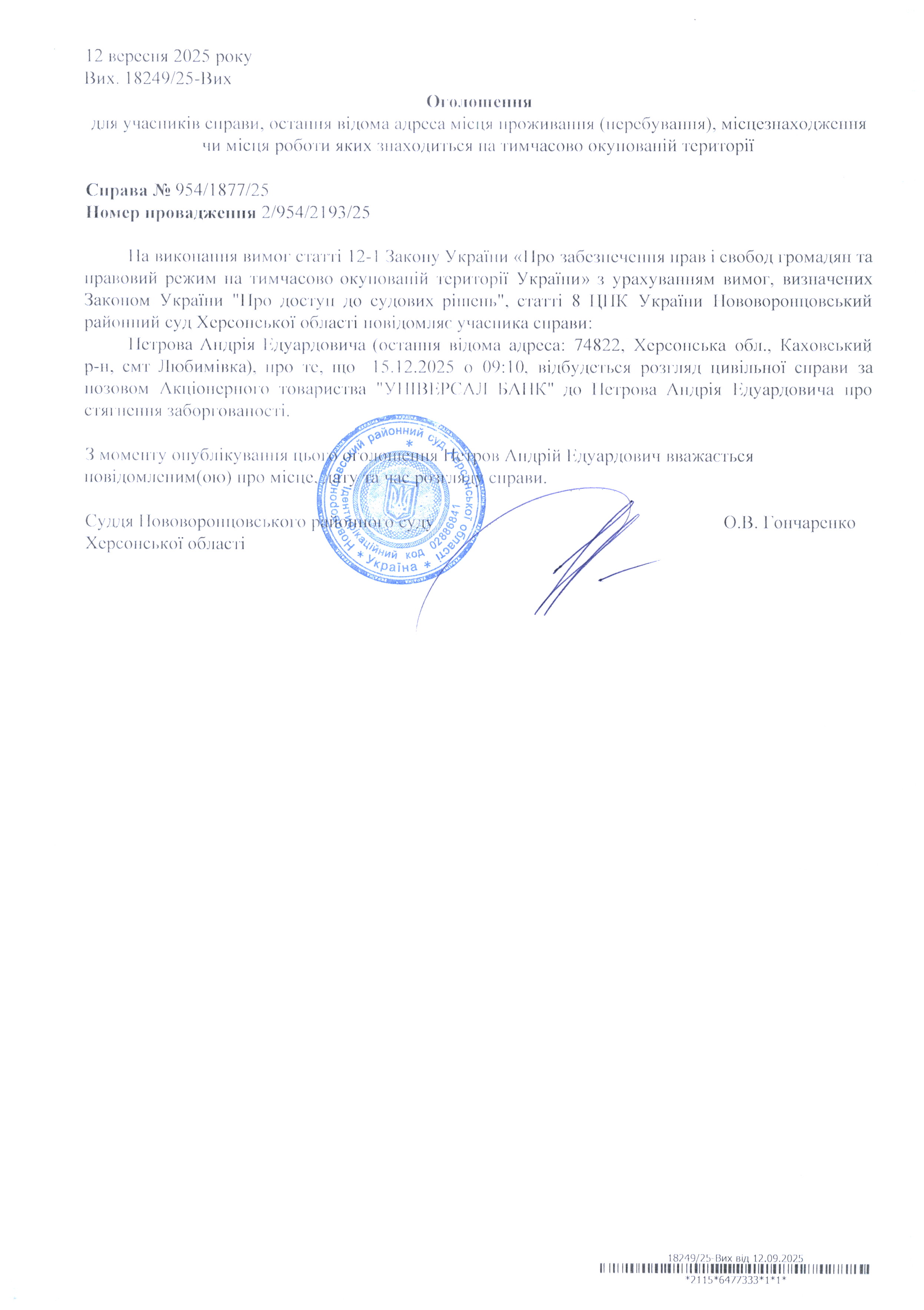 До суду викликається Петров Андрій Едуардович на 9 год. 10 хв. 15 грудня 2025 року