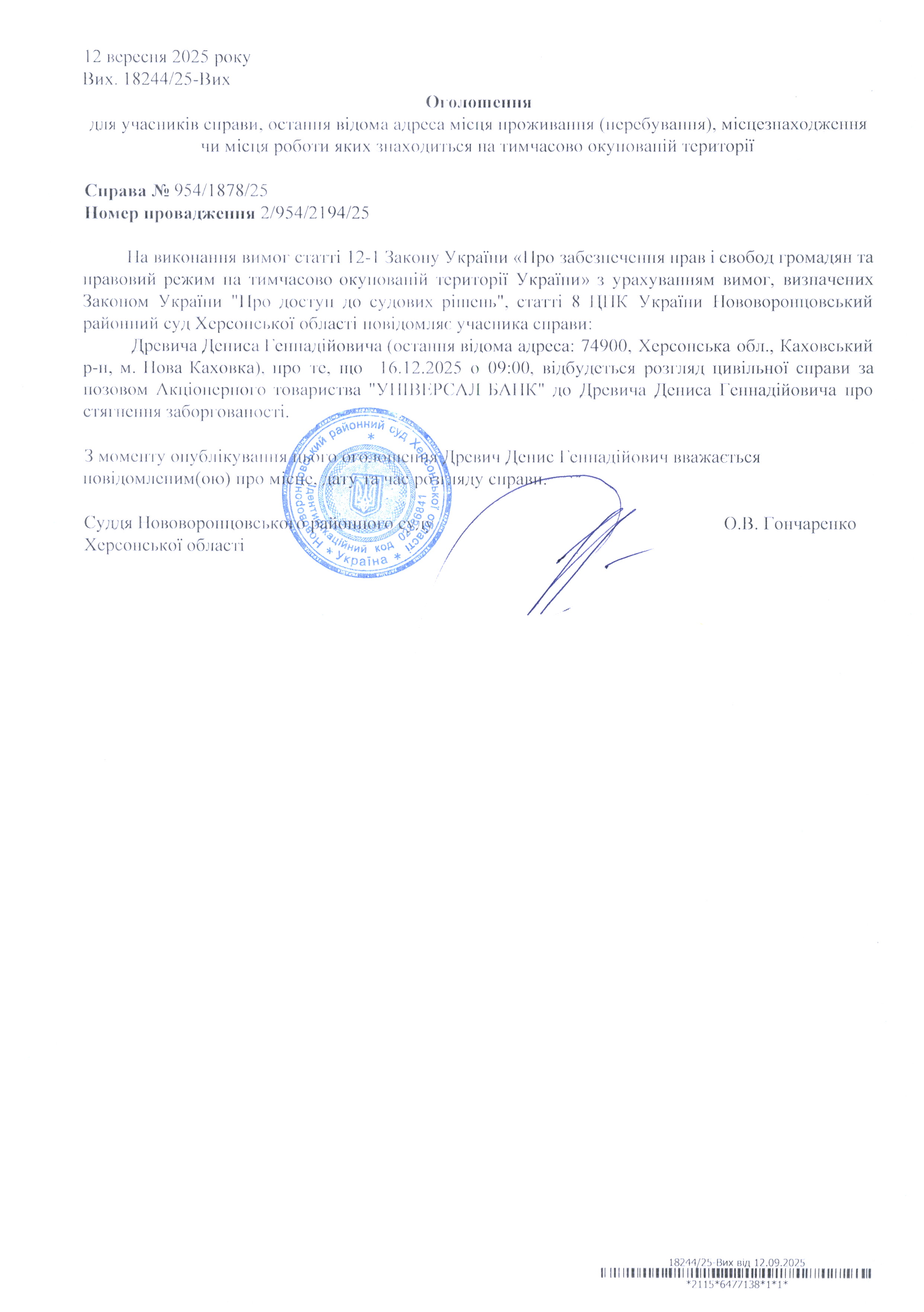 До суду викликається Древич Денис Геннадійович на 9 год. 00 хв. 16 грудня 2025 року
