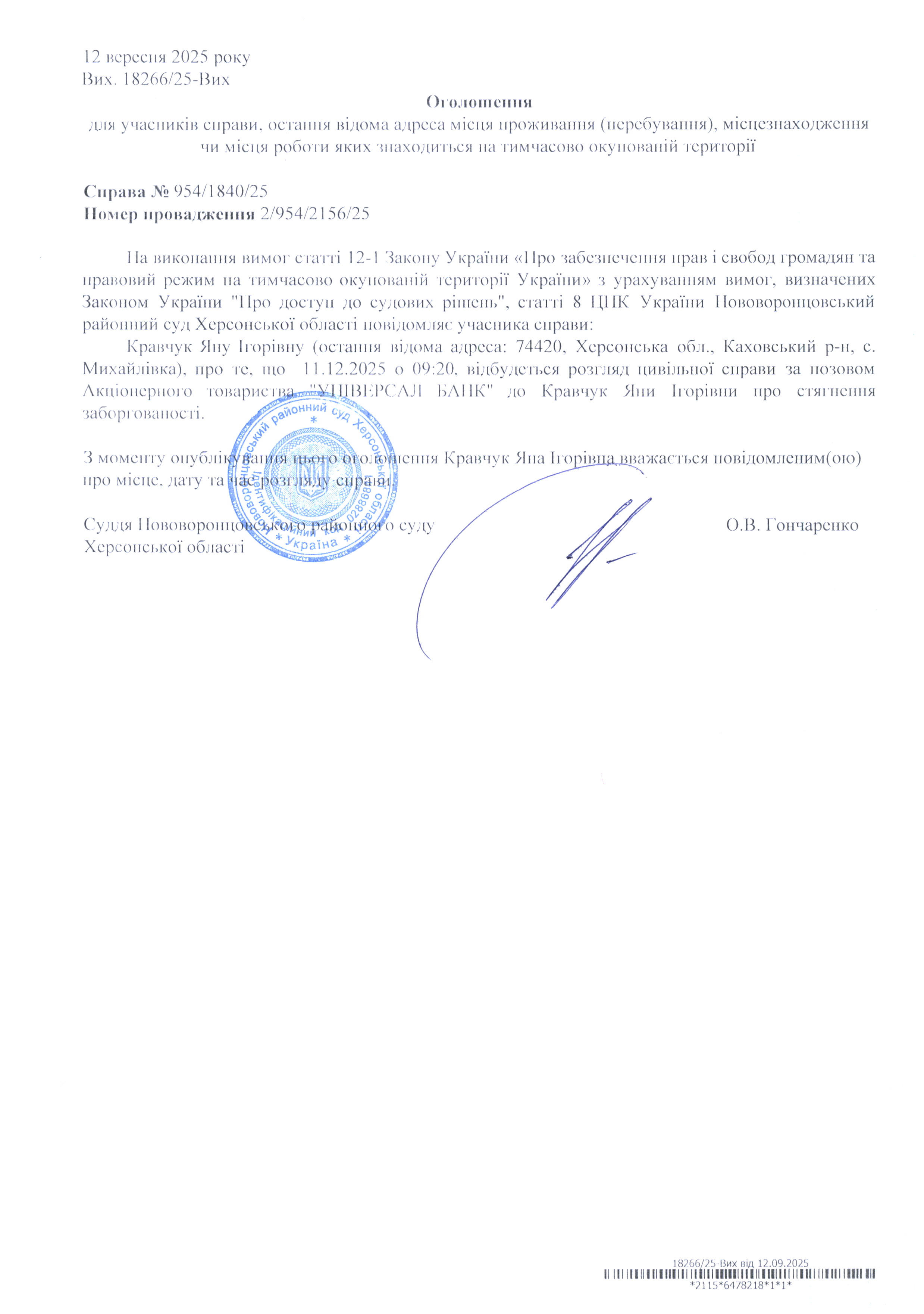 До суду викликається Кравчук Яна Ігорівна на 9 год. 20 хв. 11 грудня 2025 року