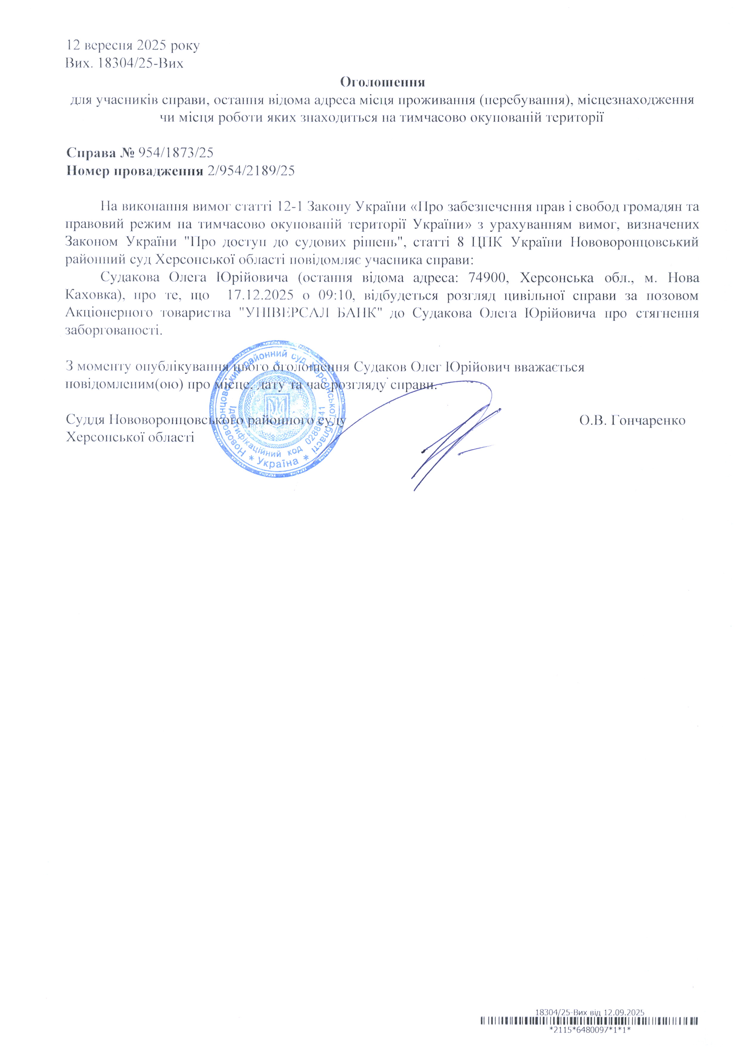 До суду викликається Судаков Олег Юрійович на 9 год. 10 хв. 17 грудня 2025 року