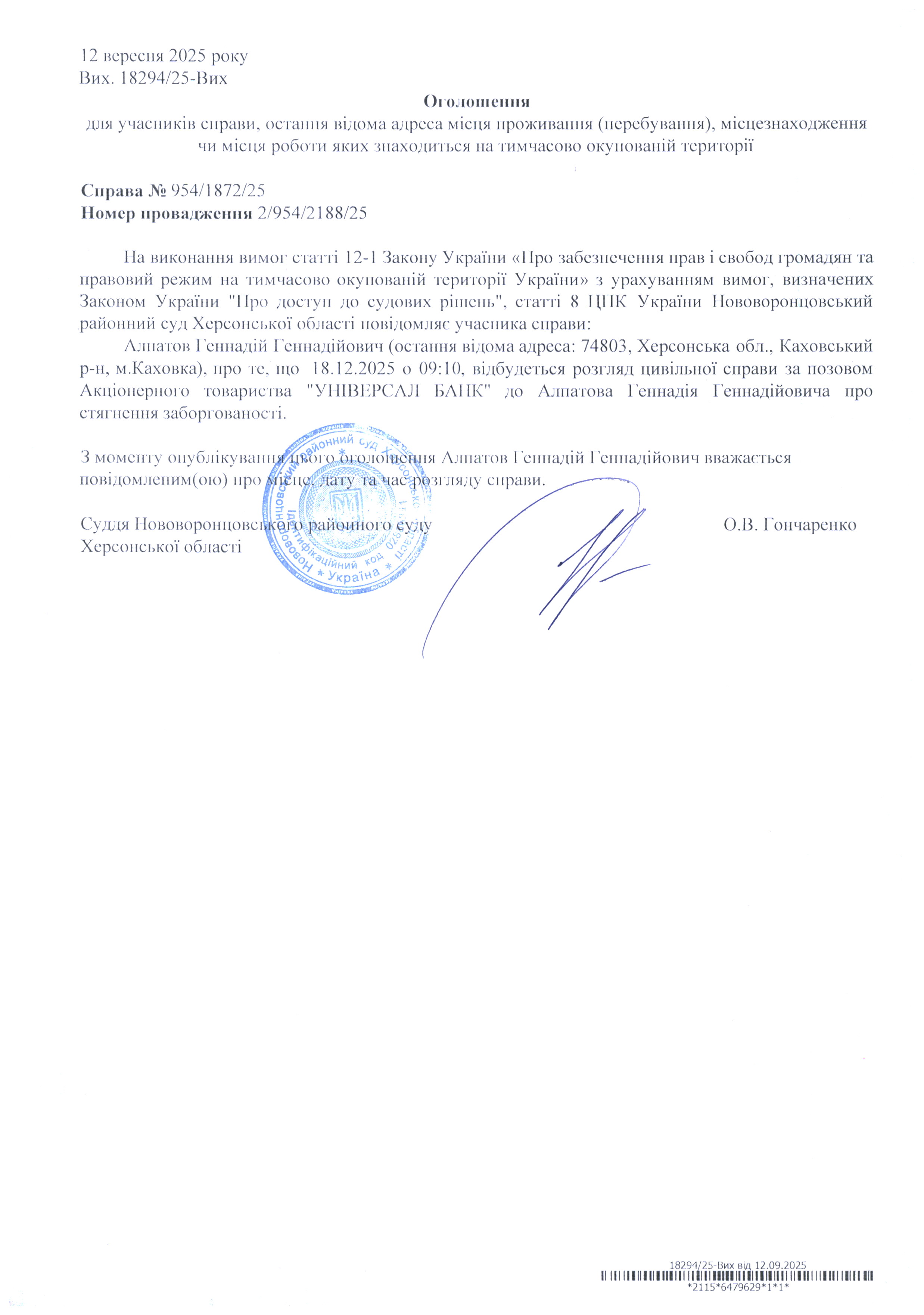 До суду викликається Алпатов Геннадій Геннадійович на 9 год. 10 хв. 18 грудня 2025 року