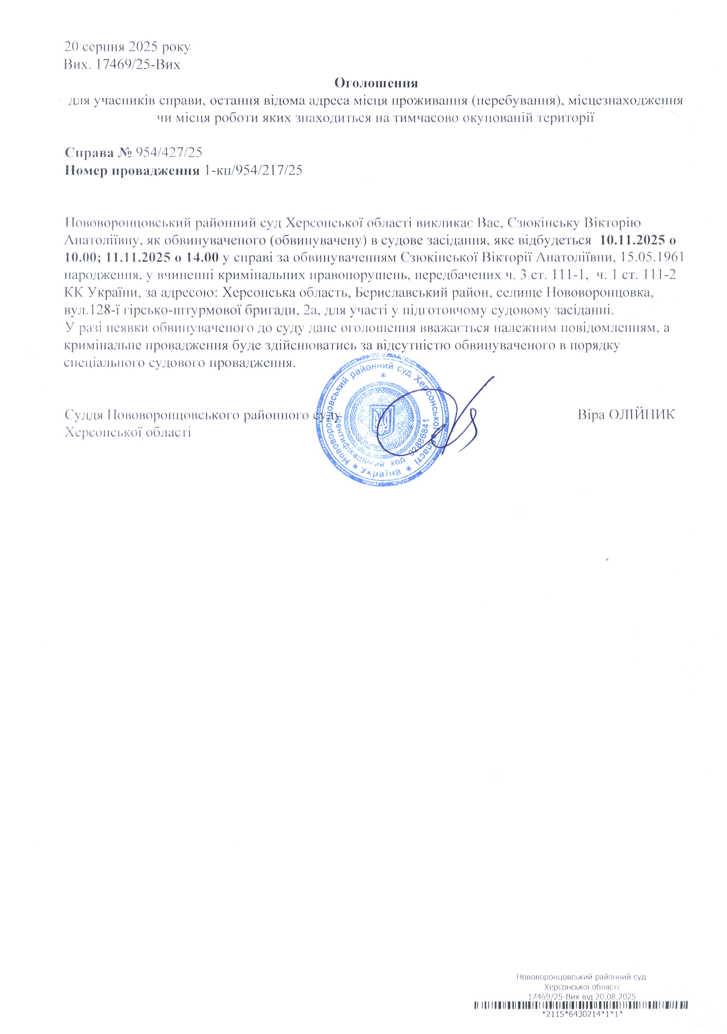 До суду викликається Єзюкінська Вікторія Анатоліївна на 10 год. 00 хв. 10 лиспотада та на 14 год. 00 хв. 11 лиспотада 2025 року