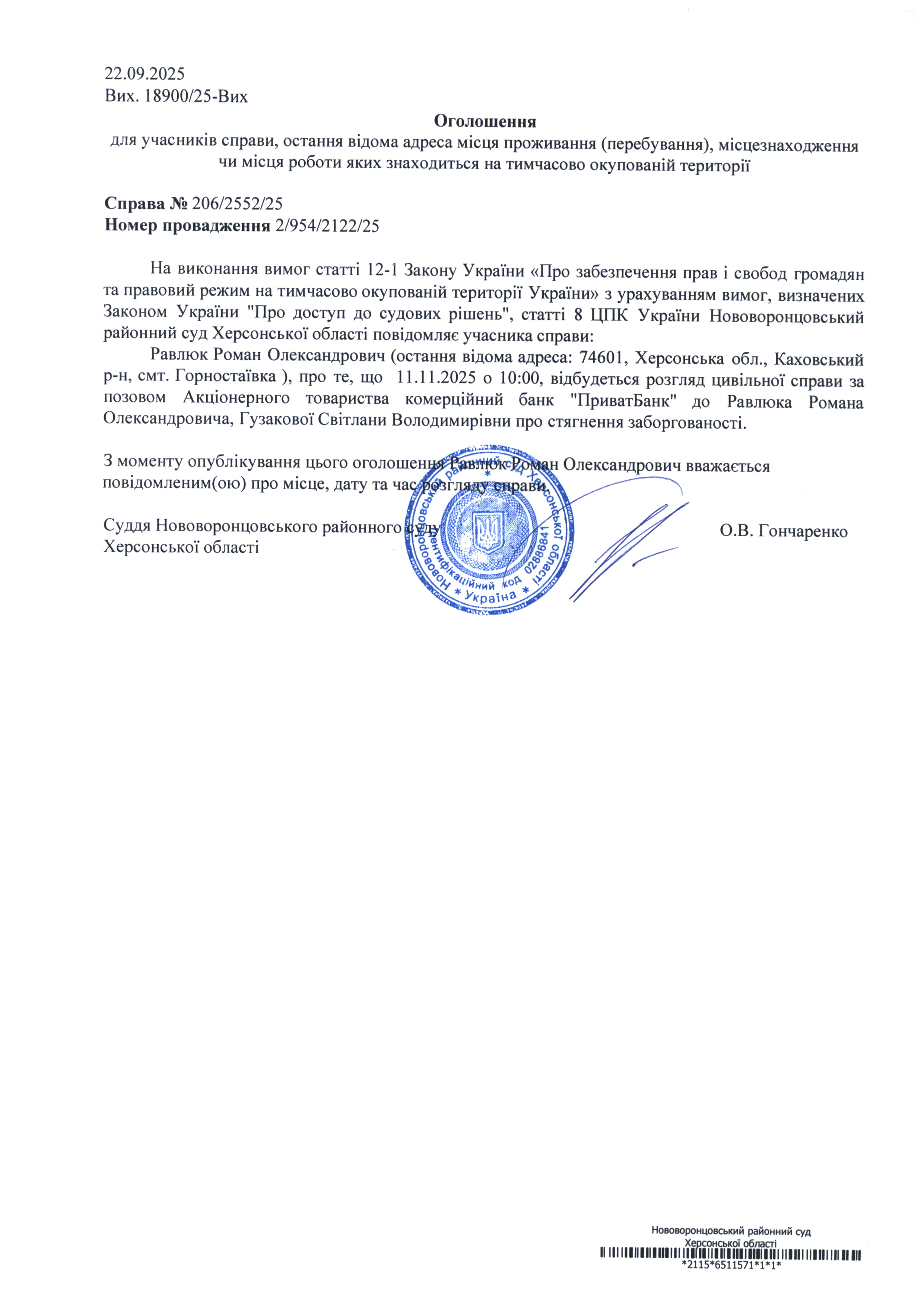 До суду викликається Равлюк Роман Олександрович на 10 год. 00 хв. 11 листопада 2025 року