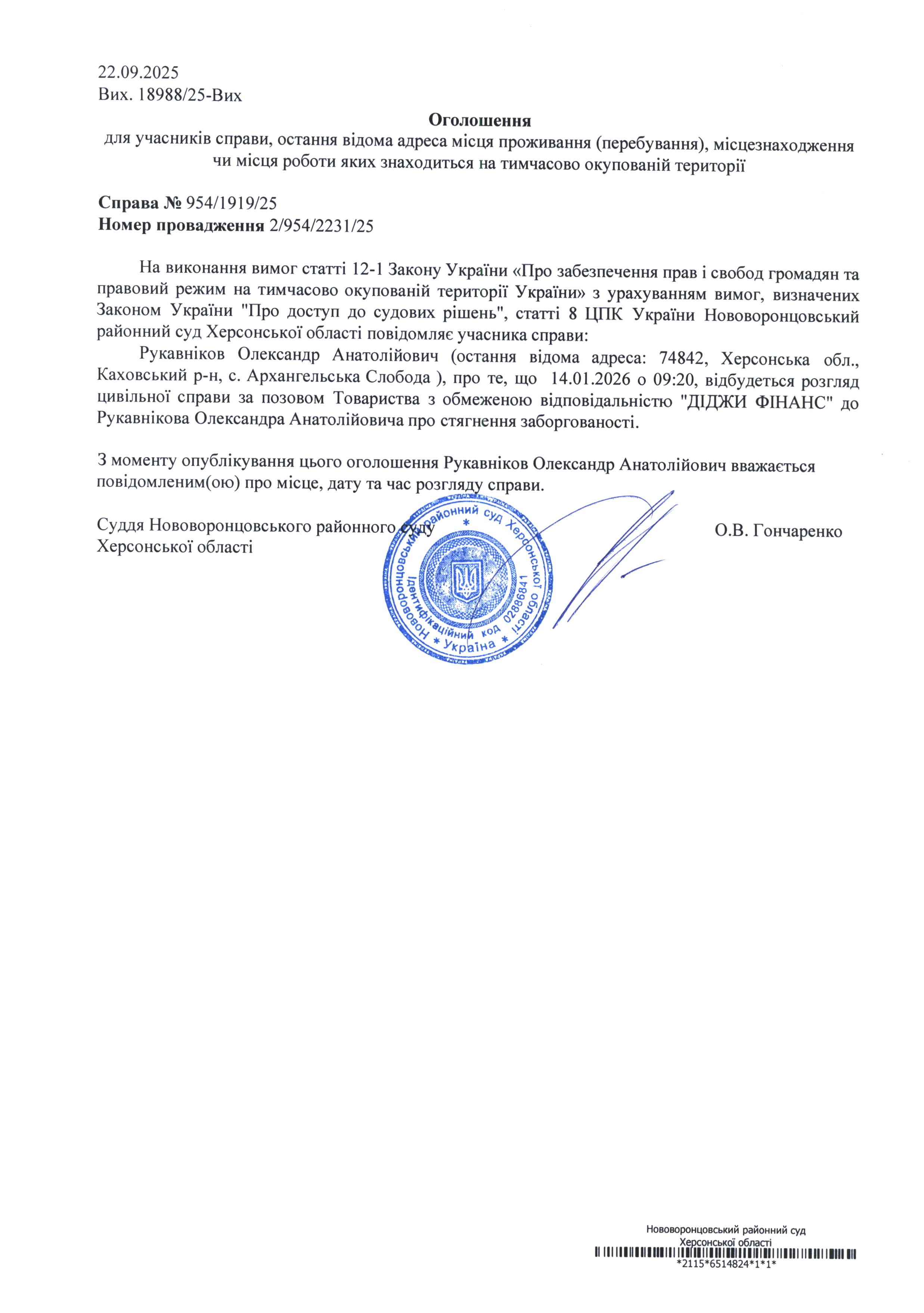 До суду викликається Рукавніков Олександр Анатолійович на 9 год. 20 хв. 14 січня 2026 року