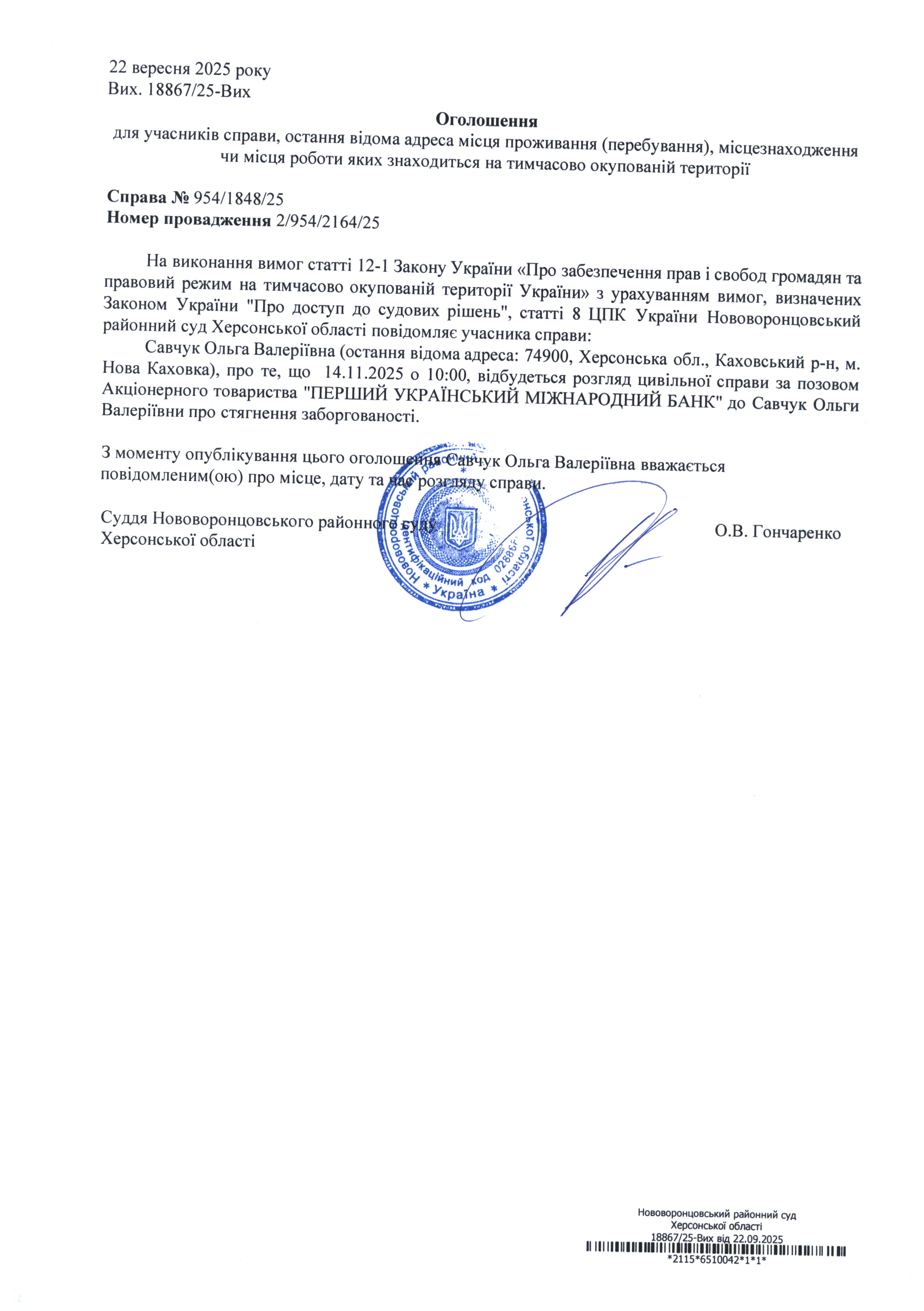 До суду викликається Савчук Ольга Валеріївна на 10 год. 00 хв. 14 листопада 2025 року