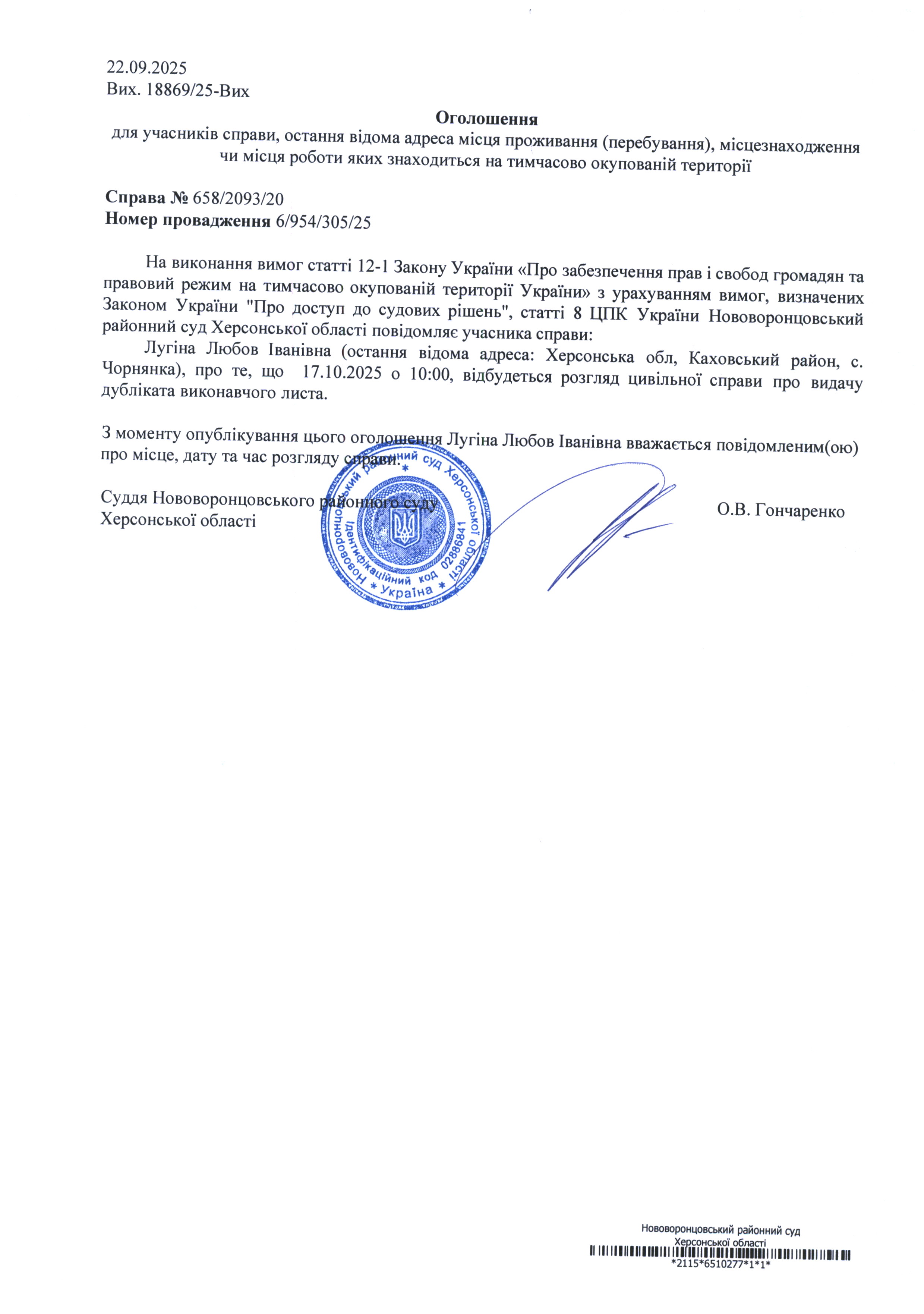До суду викликається Лугіна Любов Іванівна на 10 год. 00 хв. 17 жовтня 2025 року