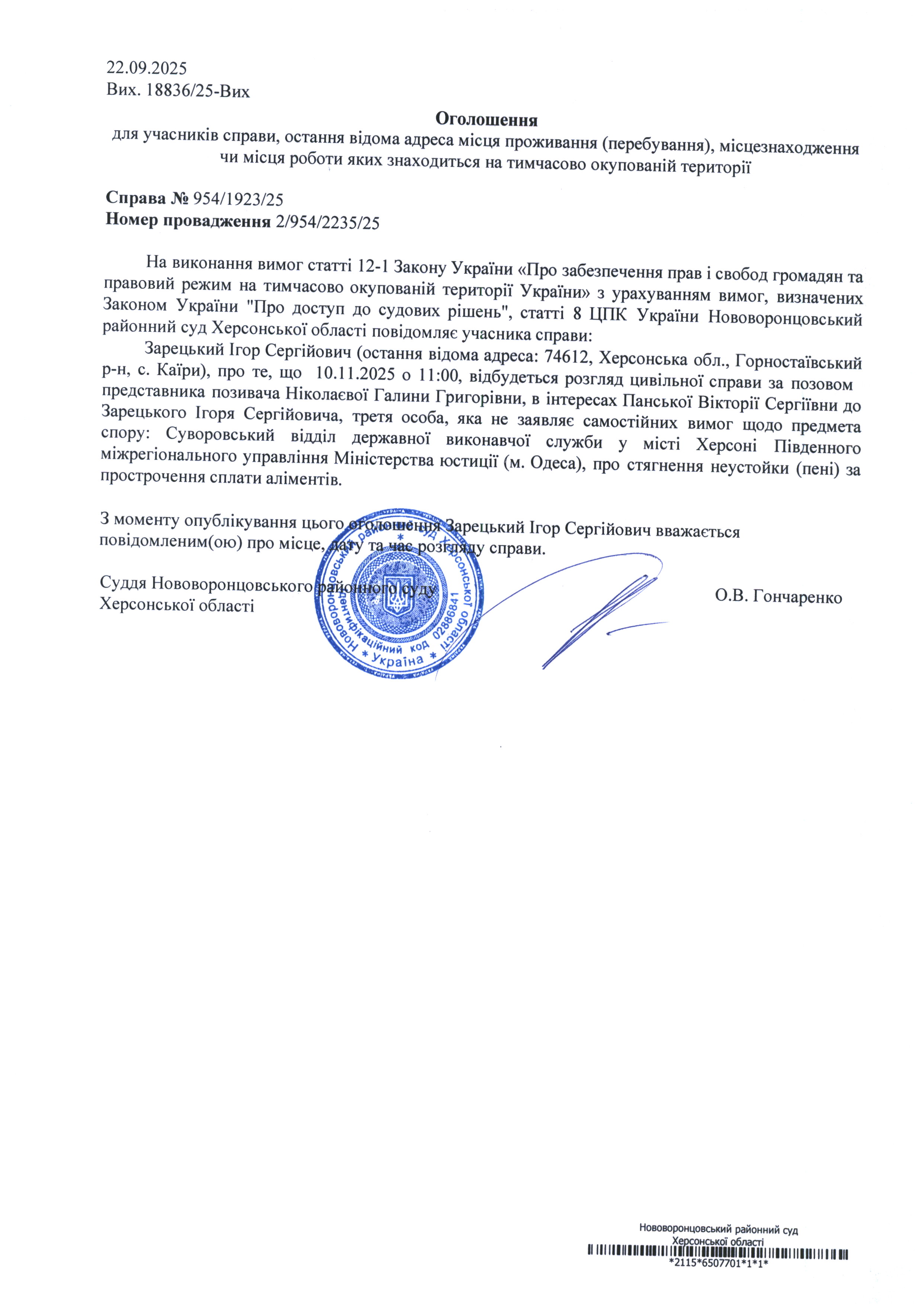 До суду викликається Зарецький Ігор Сергійович на 11 год. 00 хв. 10 листопада 2025 року