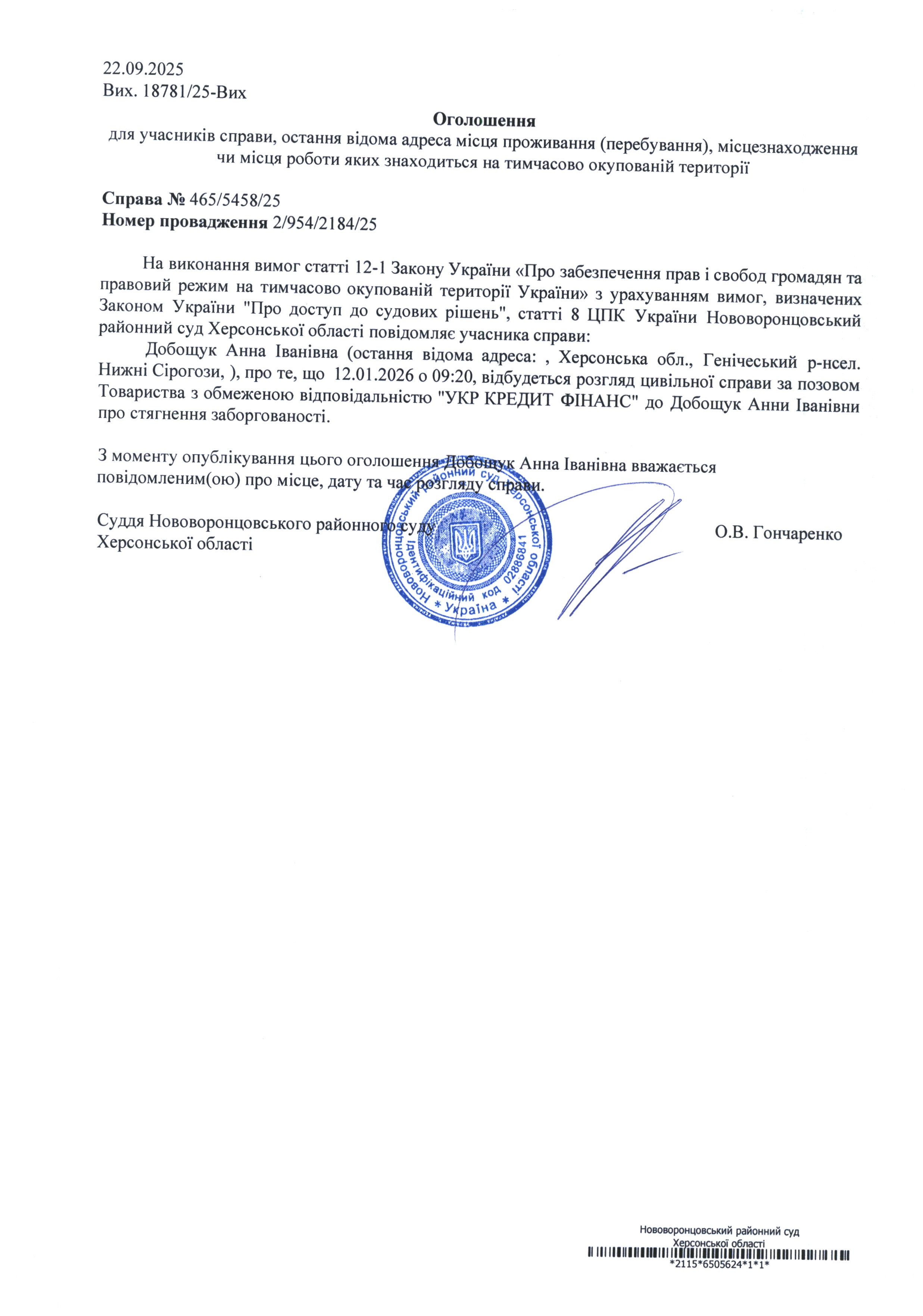 До суду викликається Добощук Анна Іванівна на 9 год. 20 хв. 12 січня 2026 року