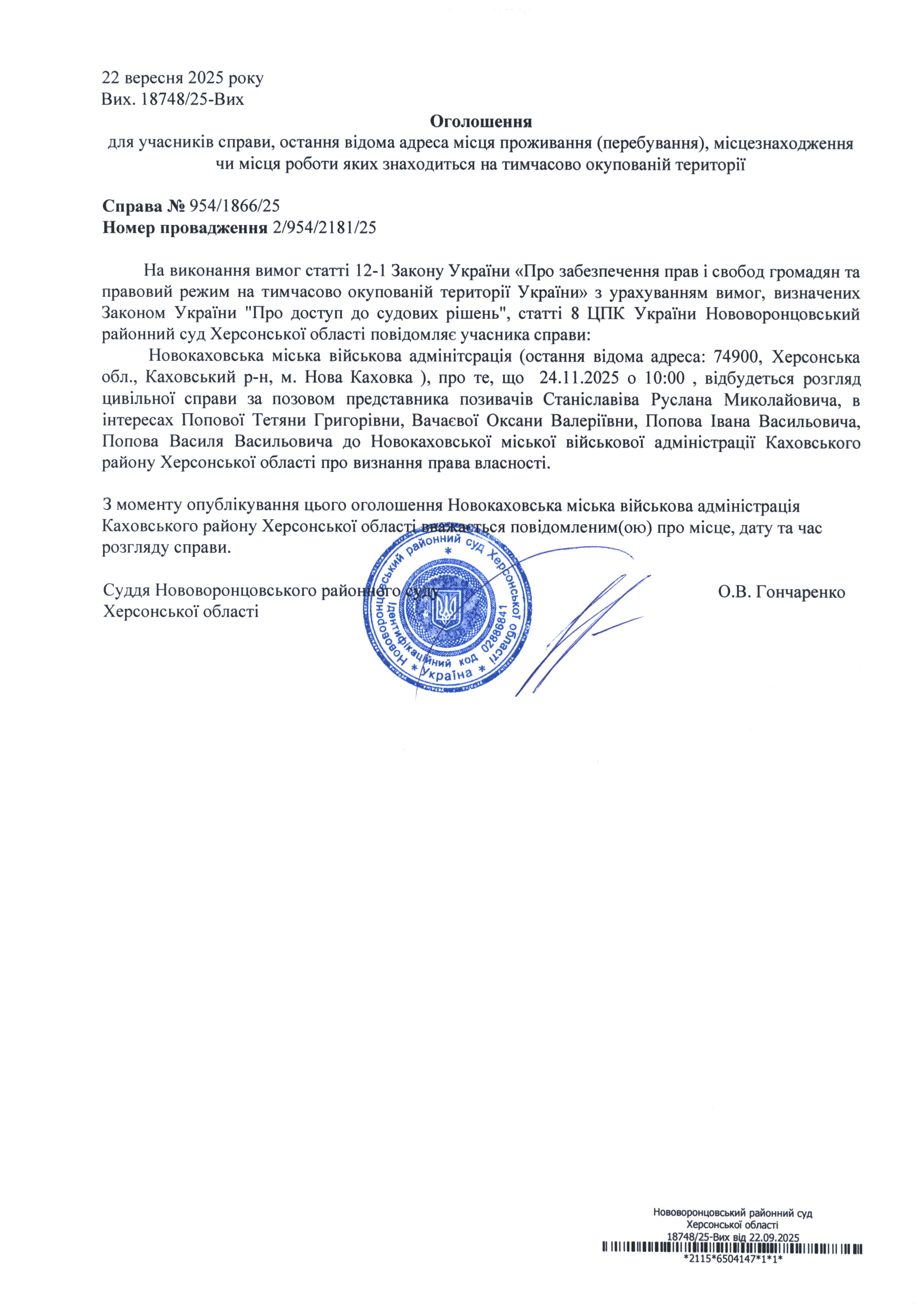 До суду викликається Новокаховська міська військова адміністрація Каховського району Херсонської областіна 10 год. 00 хв. 24 листопада 2025 року