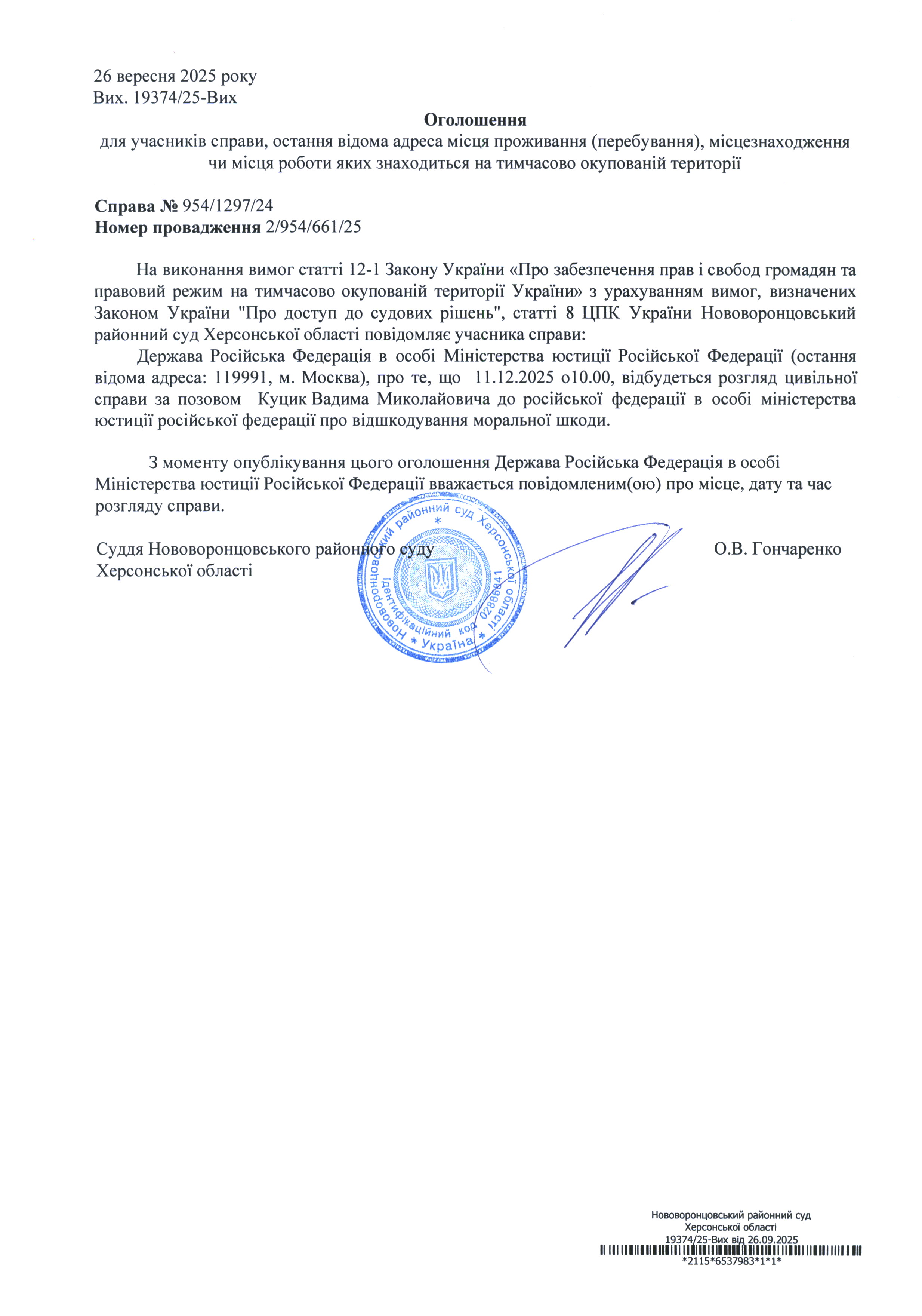 До суду викликається Держава Російська Федерація на 10 год. 00 хв. 11 грудня 2025 року