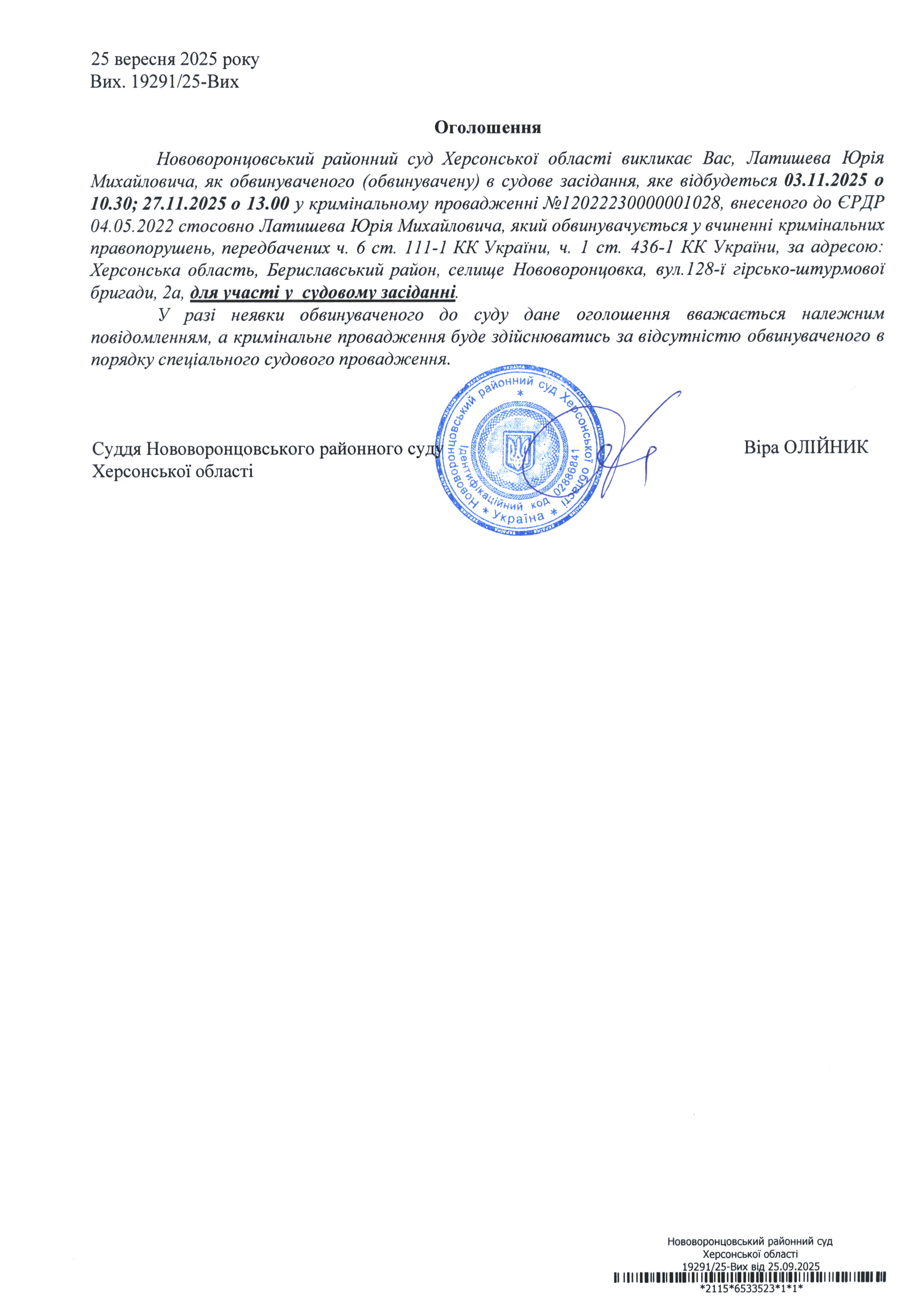 До суду викликається Латишев Юрій Михайлович на 10 год. 30 хв. 3 листопада та на 13 год. 00 хв. 27 листопада 2025 року