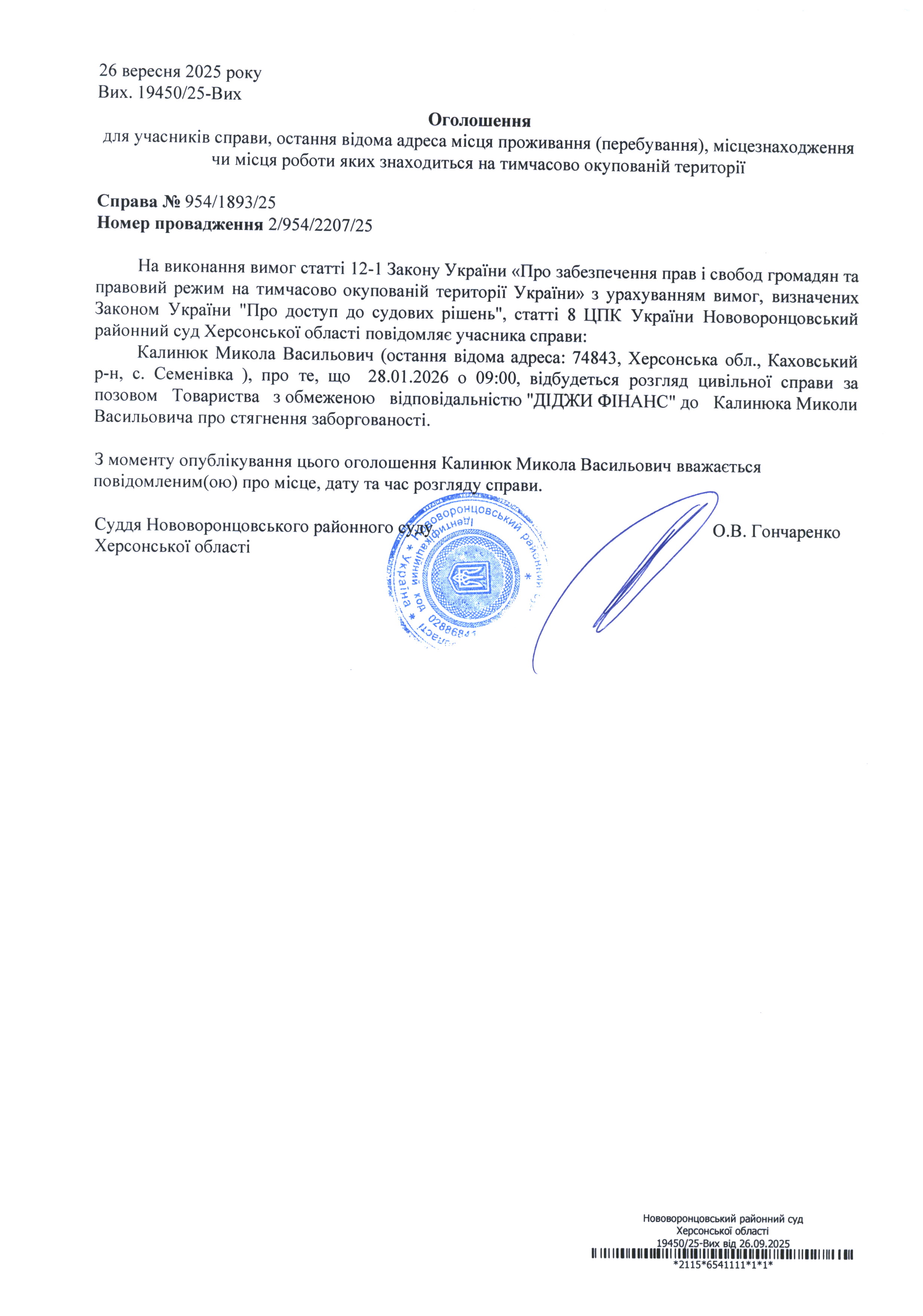 До суду викликається Калинюк Микола Васильович на 9 год. 00 хв. 28 січня 2026 року