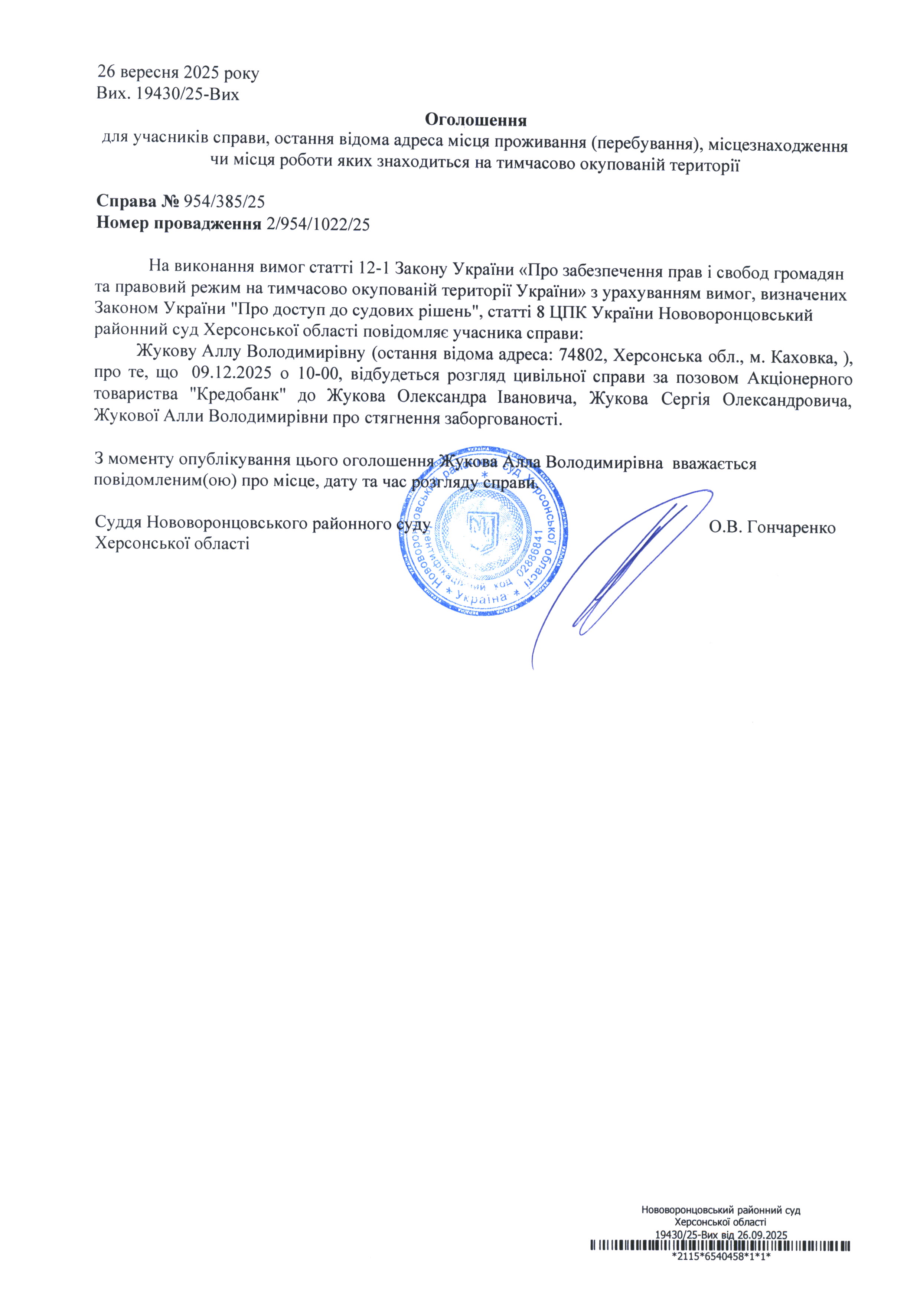 До суду викликається Жукова Алла Володимирівна на 10 год. 00 хв. 9 грудня 2025 року