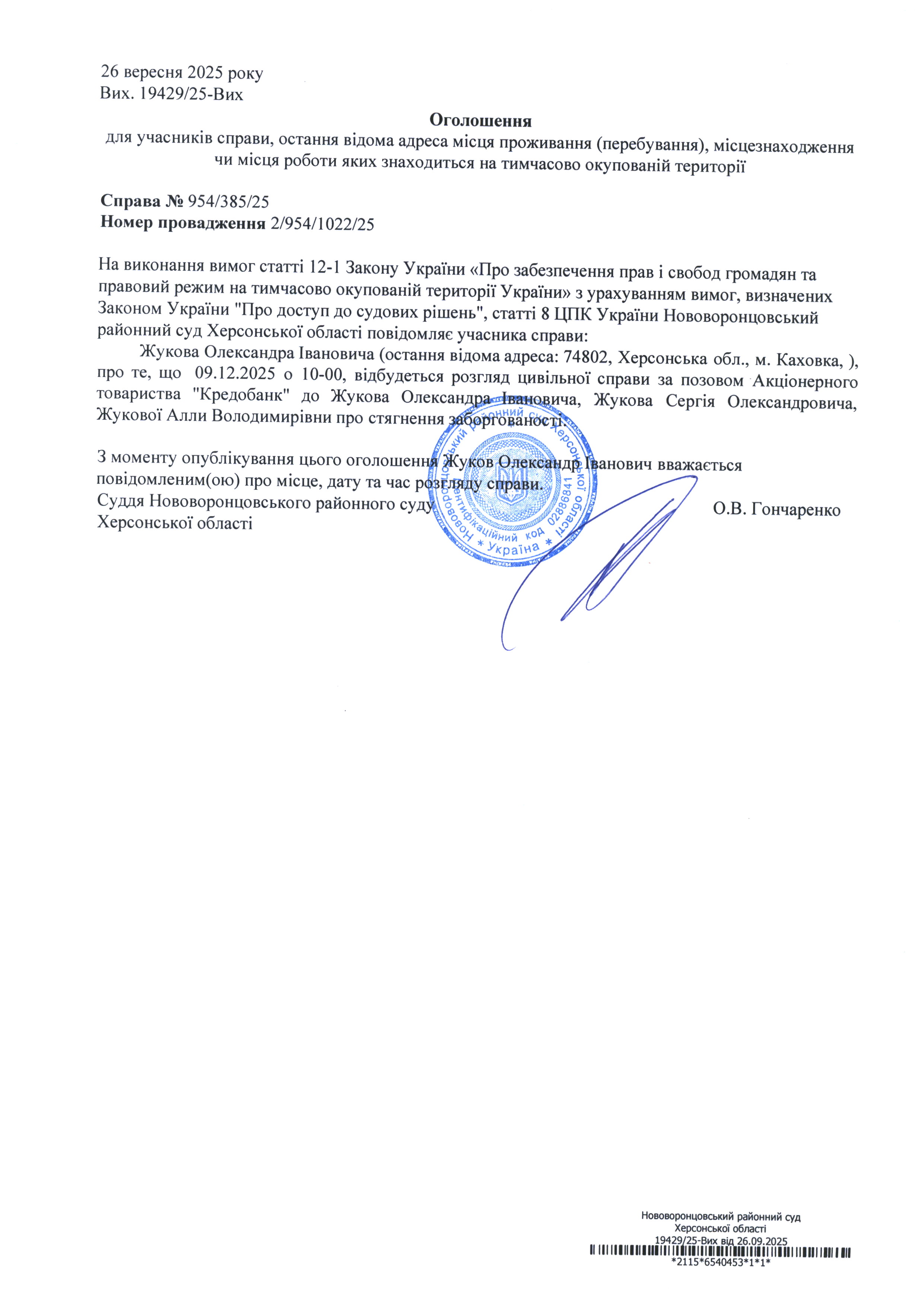 До суду викликається Жуков Олександр Іванович на 10 год. 00 хв. 9 грудня 2025 року