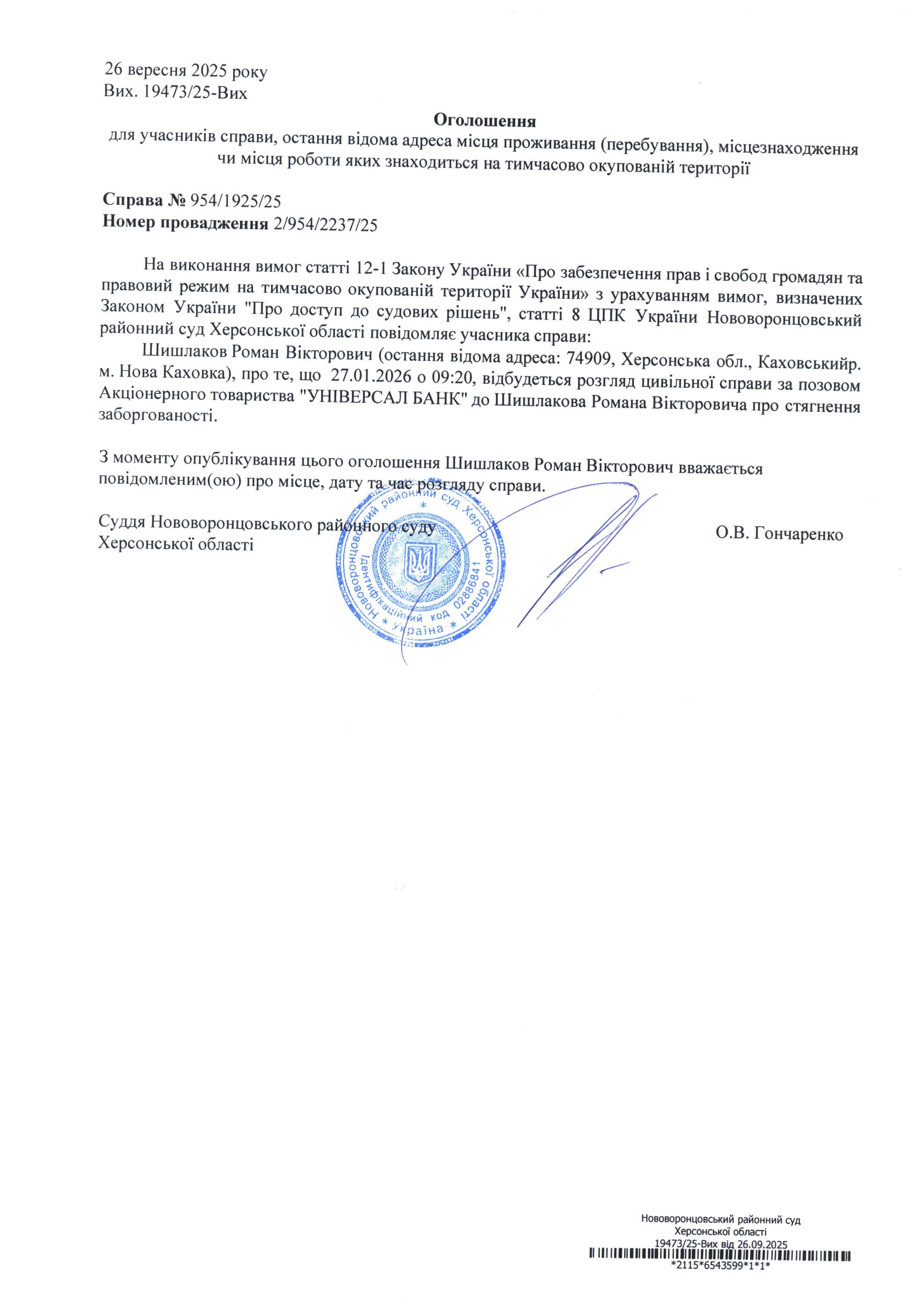 До суду викликається Шишлаков Роман Вікторович на 9 год. 20 хв. 27 січня 2026 року