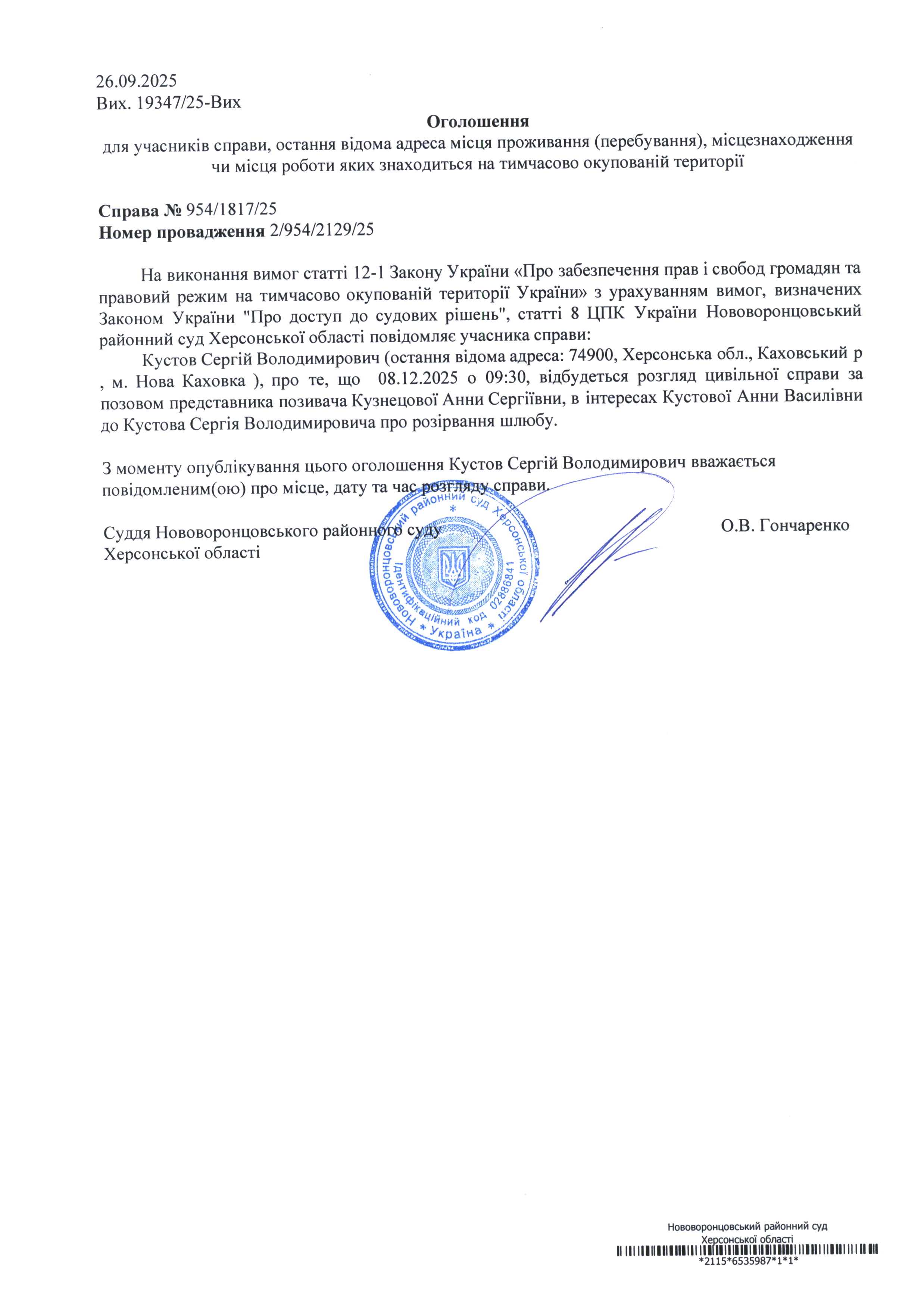 До суду викликається Кустов Сергій Володимирович на 9 год. 30 хв. 8 грудня 2025 року