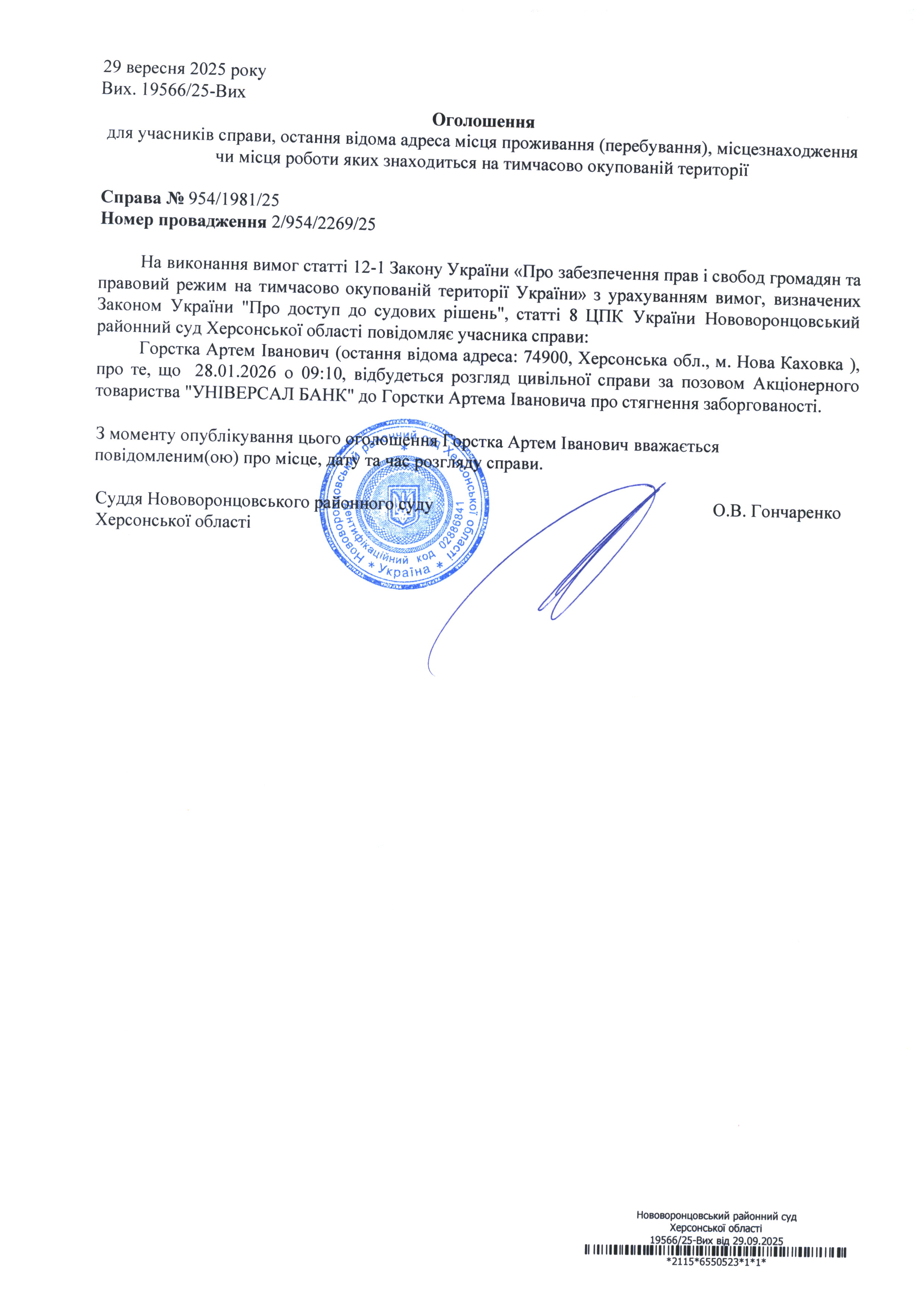 До суду викликається Горстка Артем Іванович на 9 год. 10 хв. 28 січня 2026 року