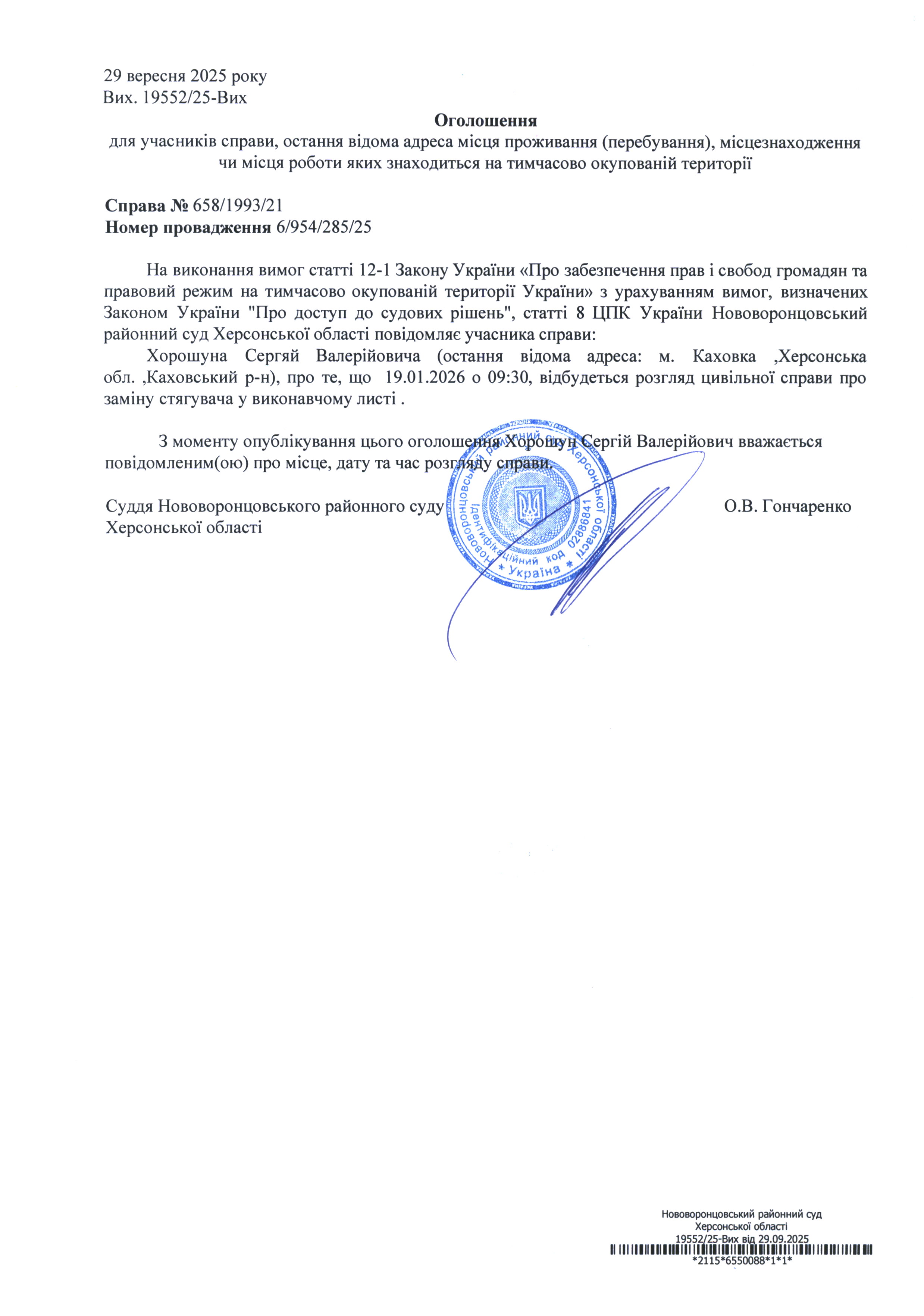 До суду викликається Хорошун Сергій Валерійович на 9 год. 30 хв. 19 січня 2026 року