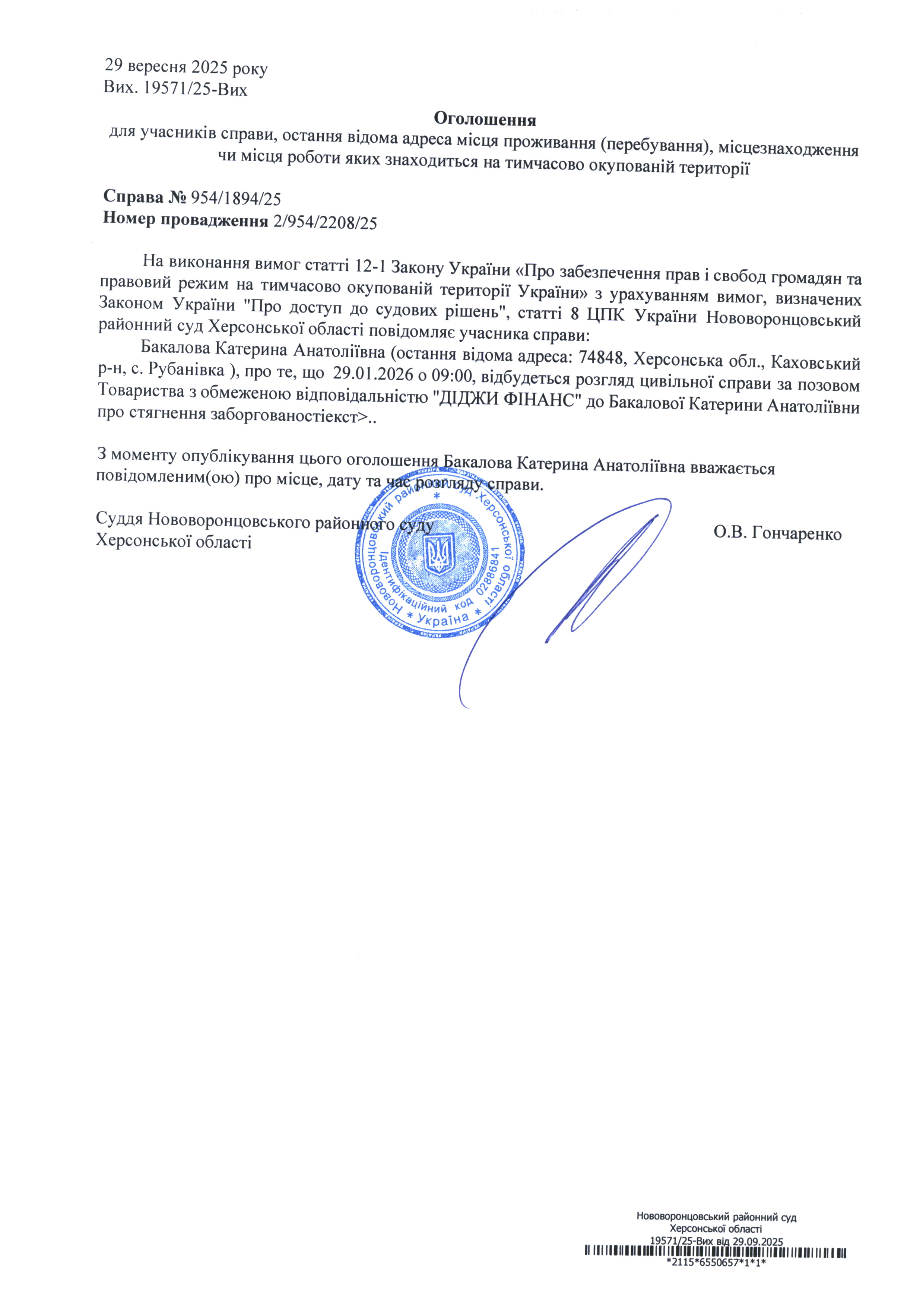 До суду викликається Бакалова Катерина Анатоліївна на 9 год. 00 хв. 29 січня 2026 року