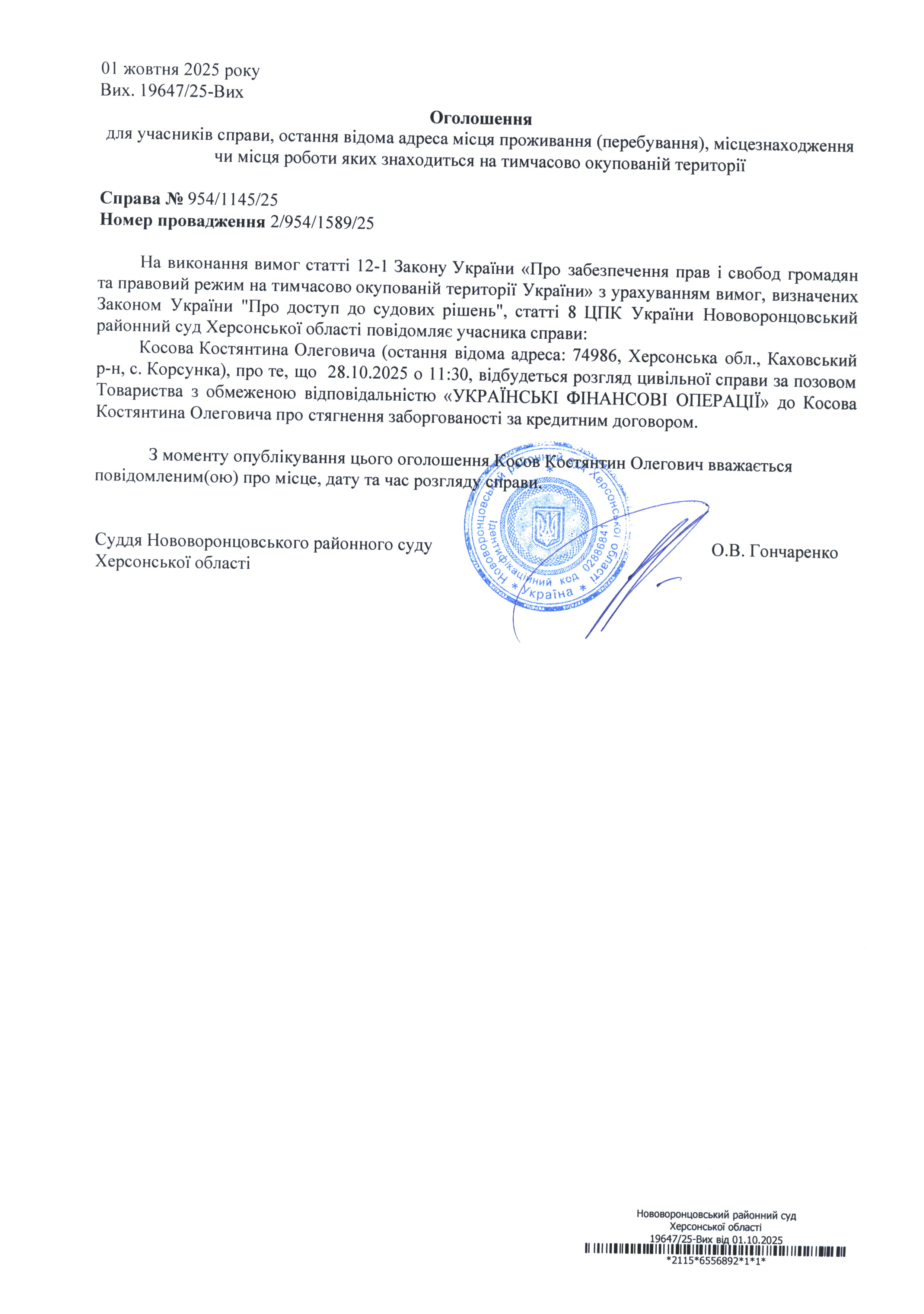 До суду викликається Косов Костянтин Олегович на 11 год. 30 хв. 28 жовтня 2025 року