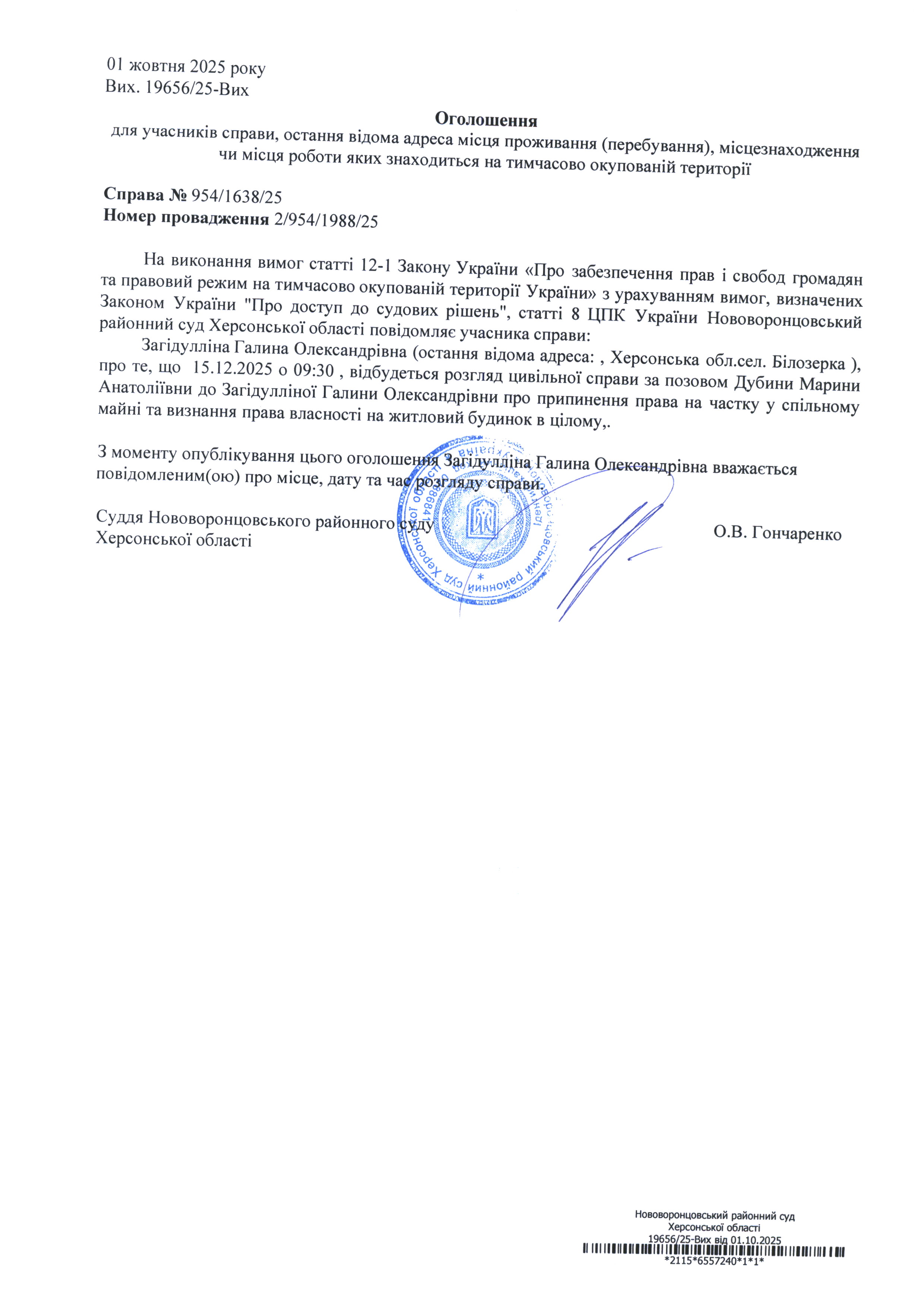 До суду викликається Загідулліна Галина Олександрівна на 9 год. 30 хв. 15 грудня 2025 року