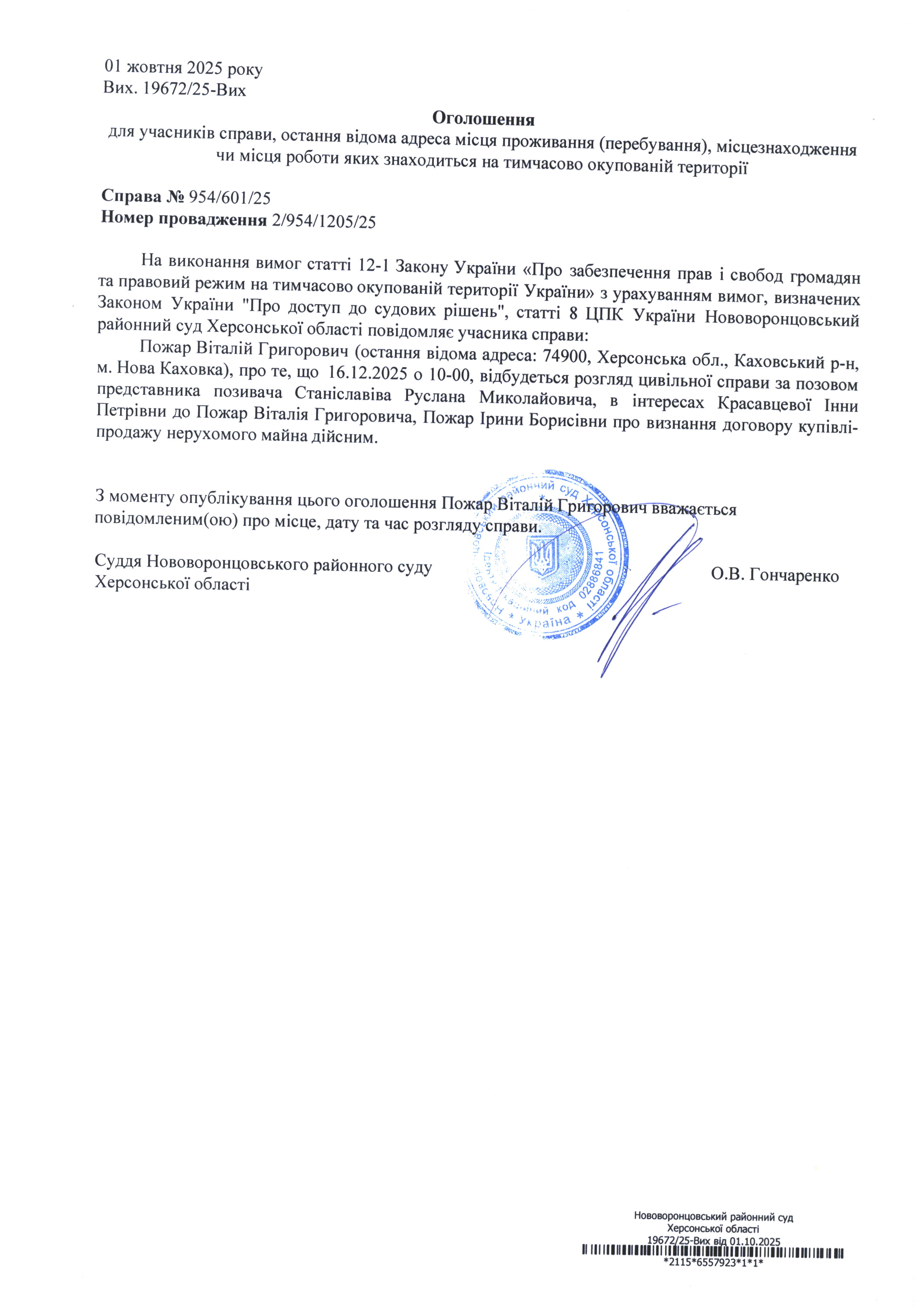 До суду викликається Пожар Віталій Григорович на 10 год. 00 хв. 16 грудня 2025 року