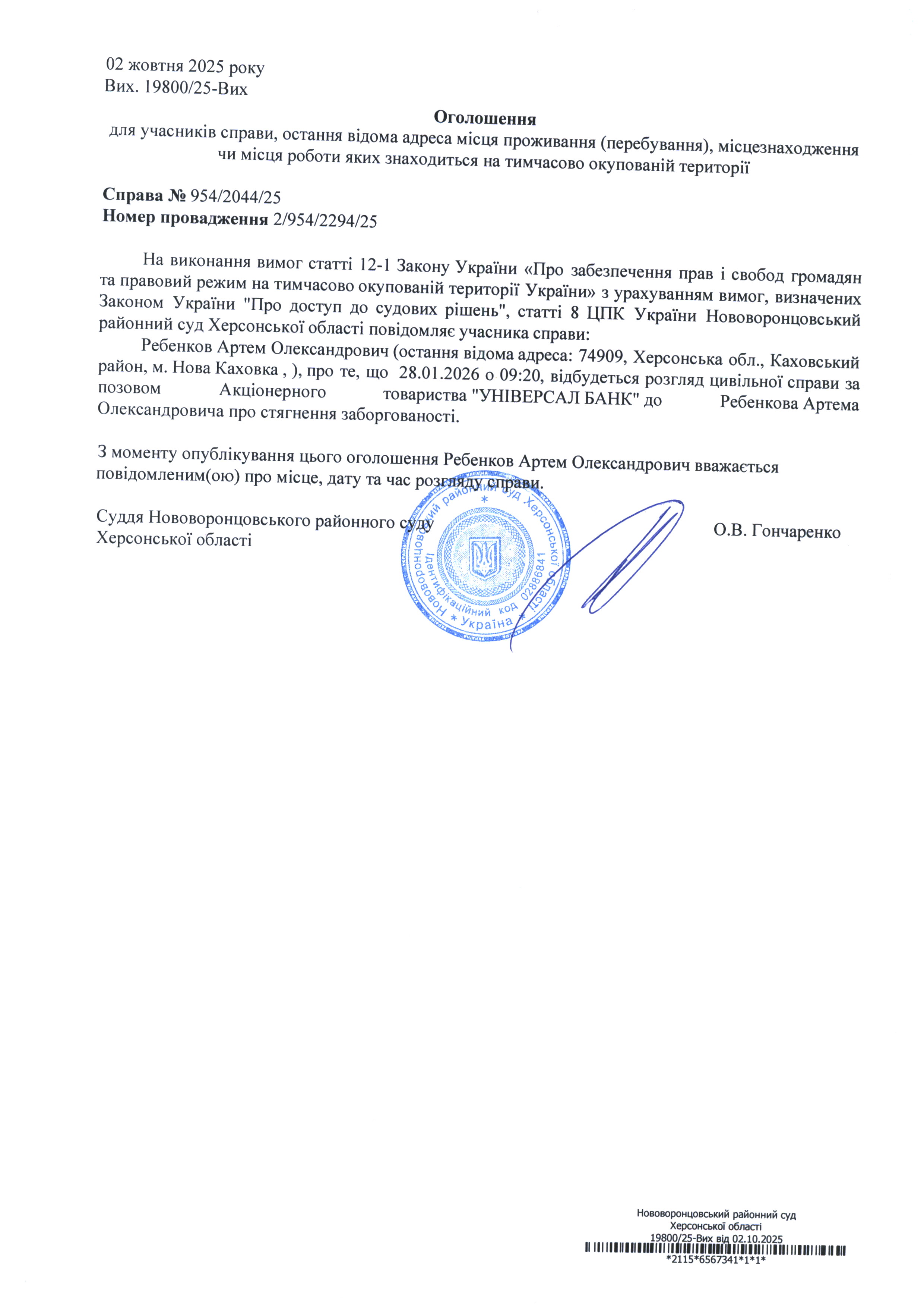До суду викликається Ребенков Артем Олександрович на 9 год. 20 хв. 28 січня 2026 року