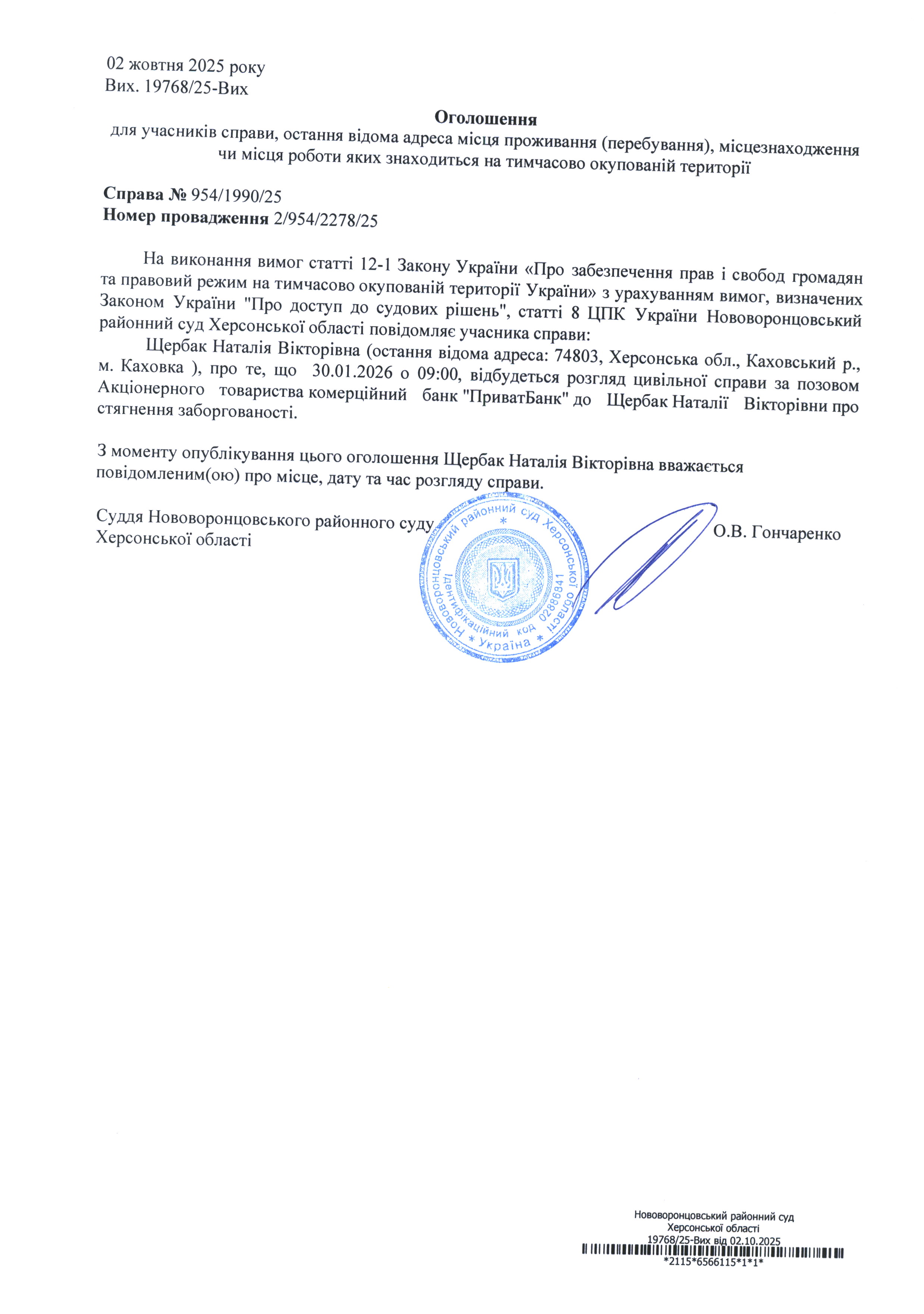 До суду викликається Щербак Наталія Вікторівна на 9 год. 00 хв. 30 січня 2026 року