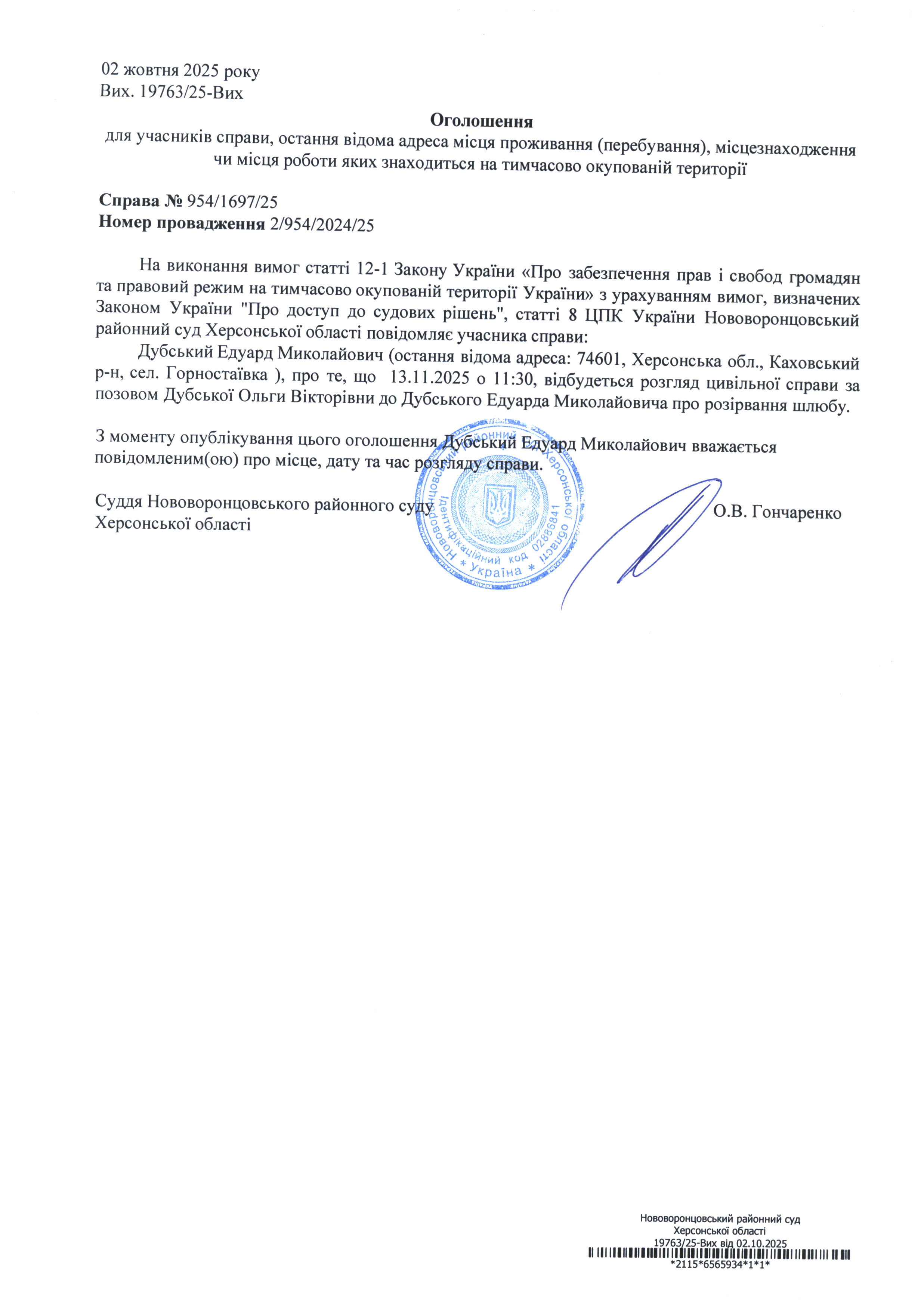 До суду викликається Дубський Едуард Миколайович на 11 год. 30 хв. 13 листопада 2025 року