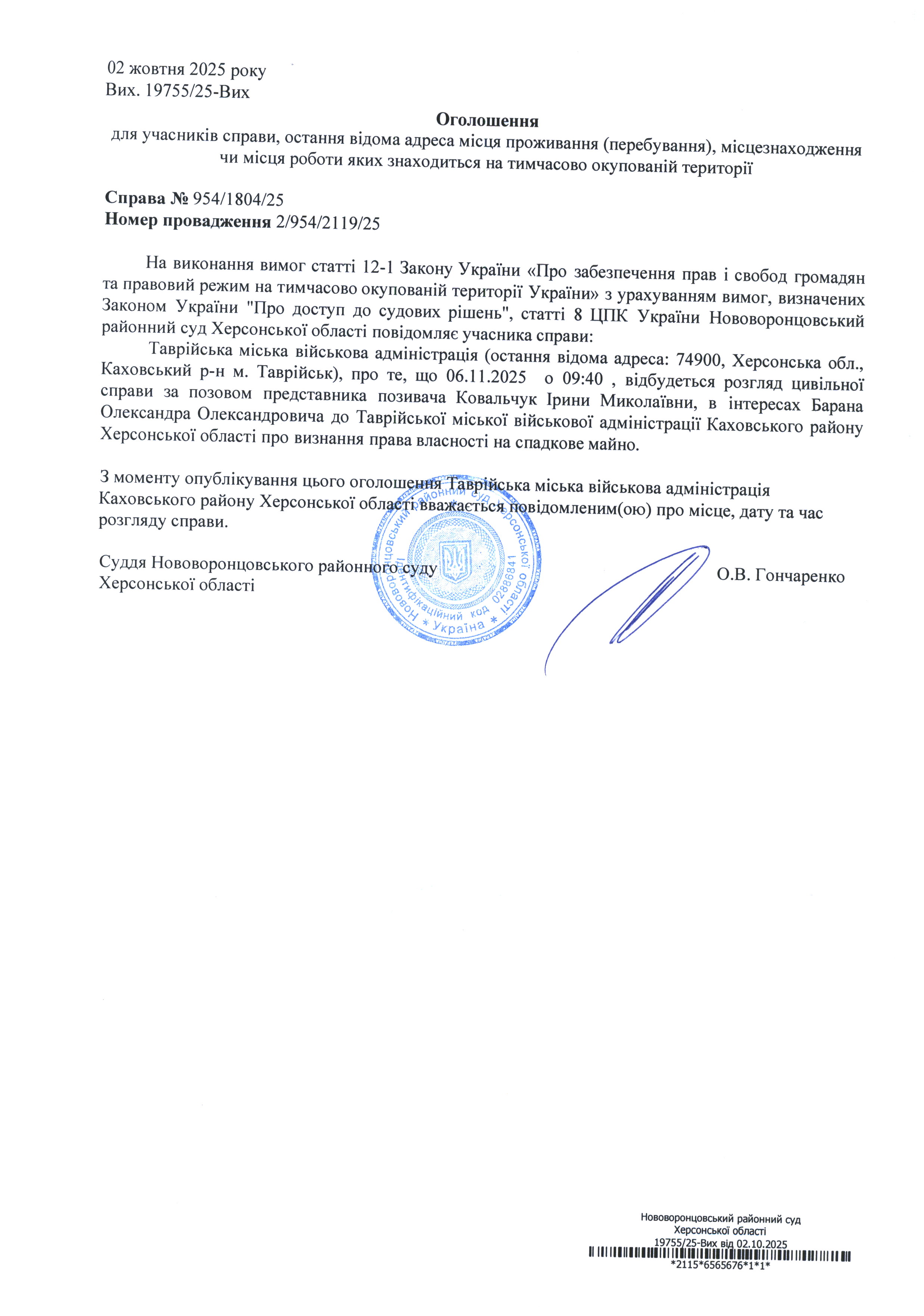 До суду викликається Таврійська міська військова адміністрація Каховського району Херсонської області на 9 год. 40 хв. 6 листопада 2025 року