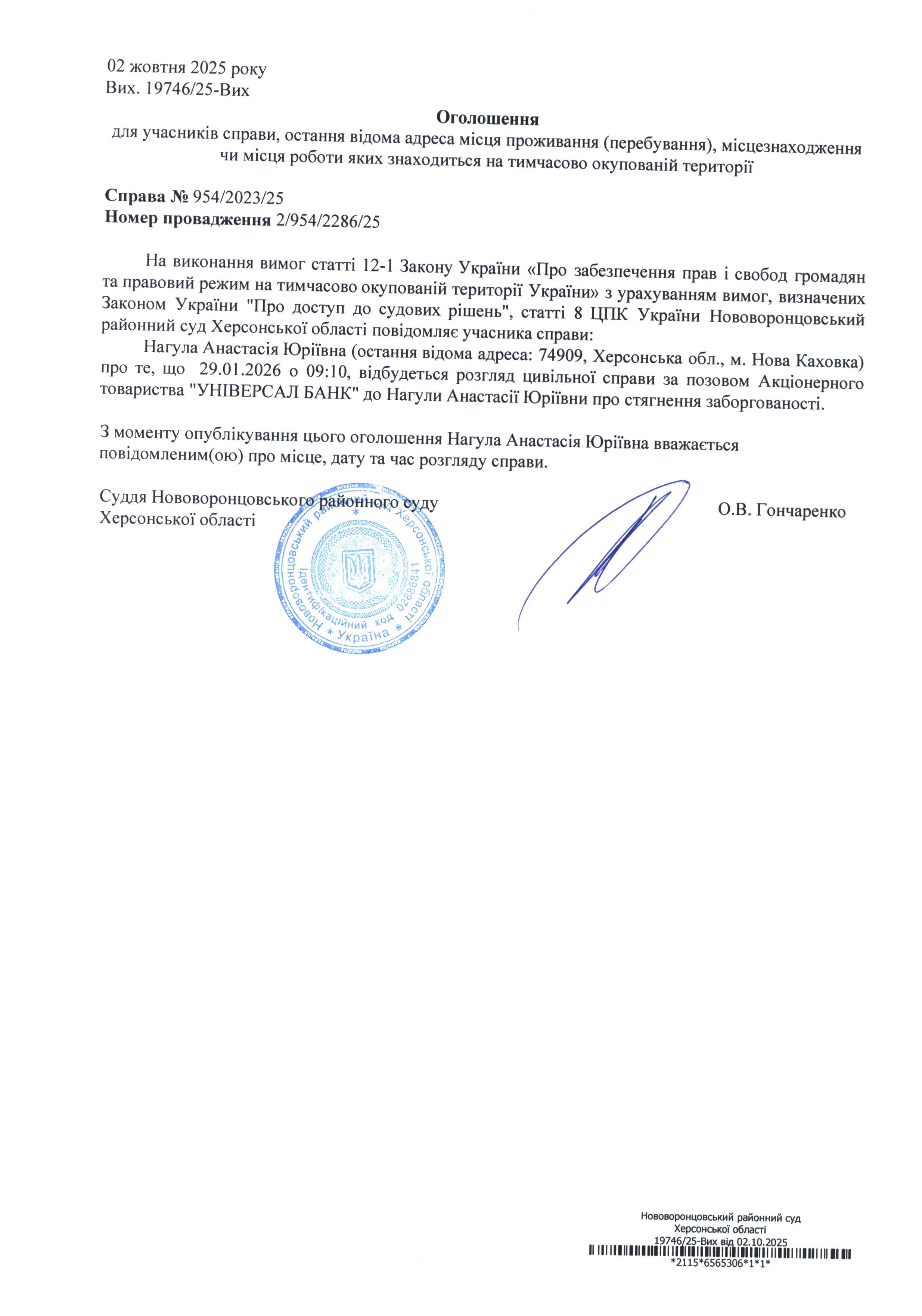 До суду викликається Нагула Анастасія Юріївна на 9 год. 10 хв. 29 січня 2026 року