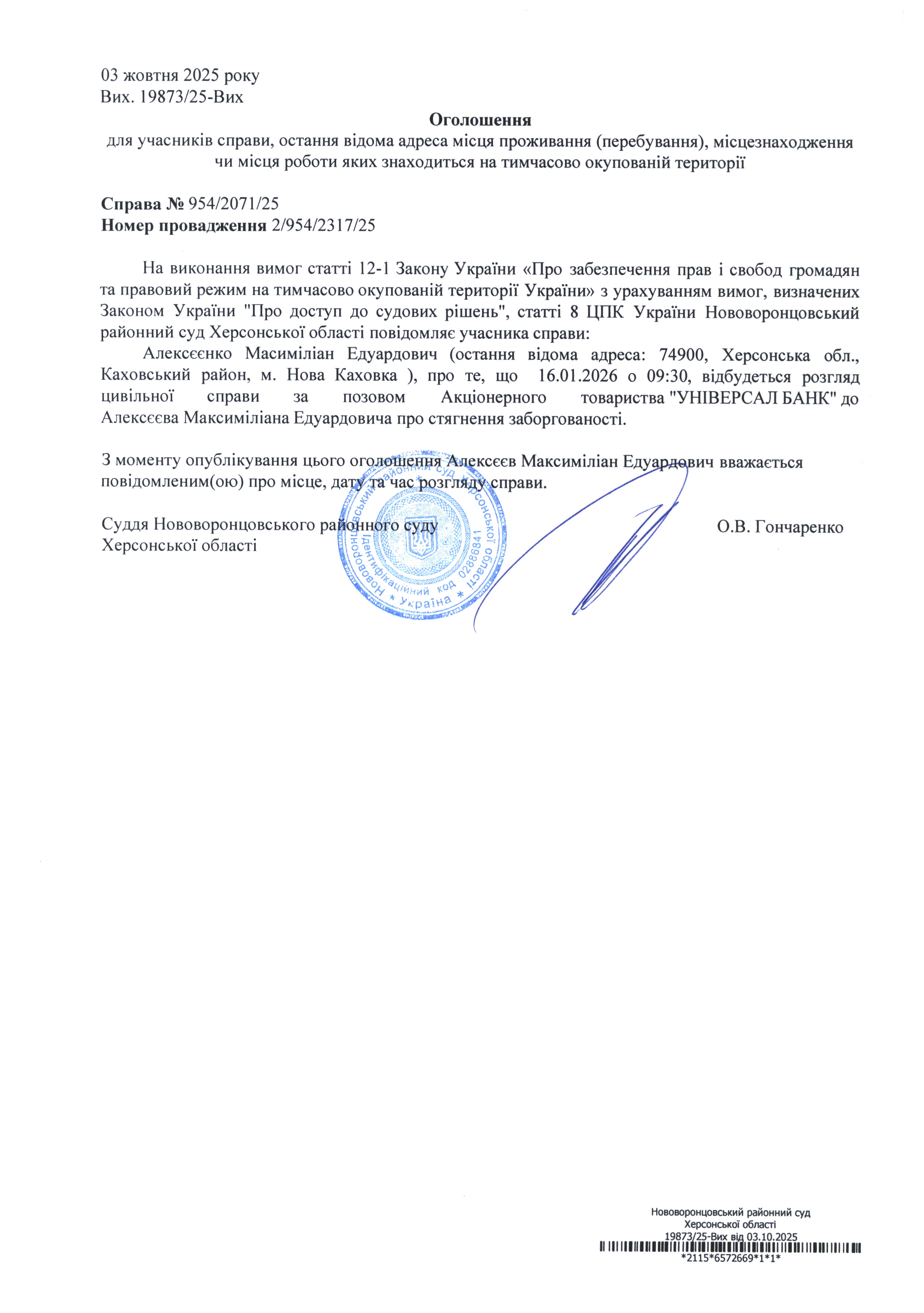 До суду викликається Алексеєнко Максиміліан Едуардович на 9-30 16 січня 2026 року
