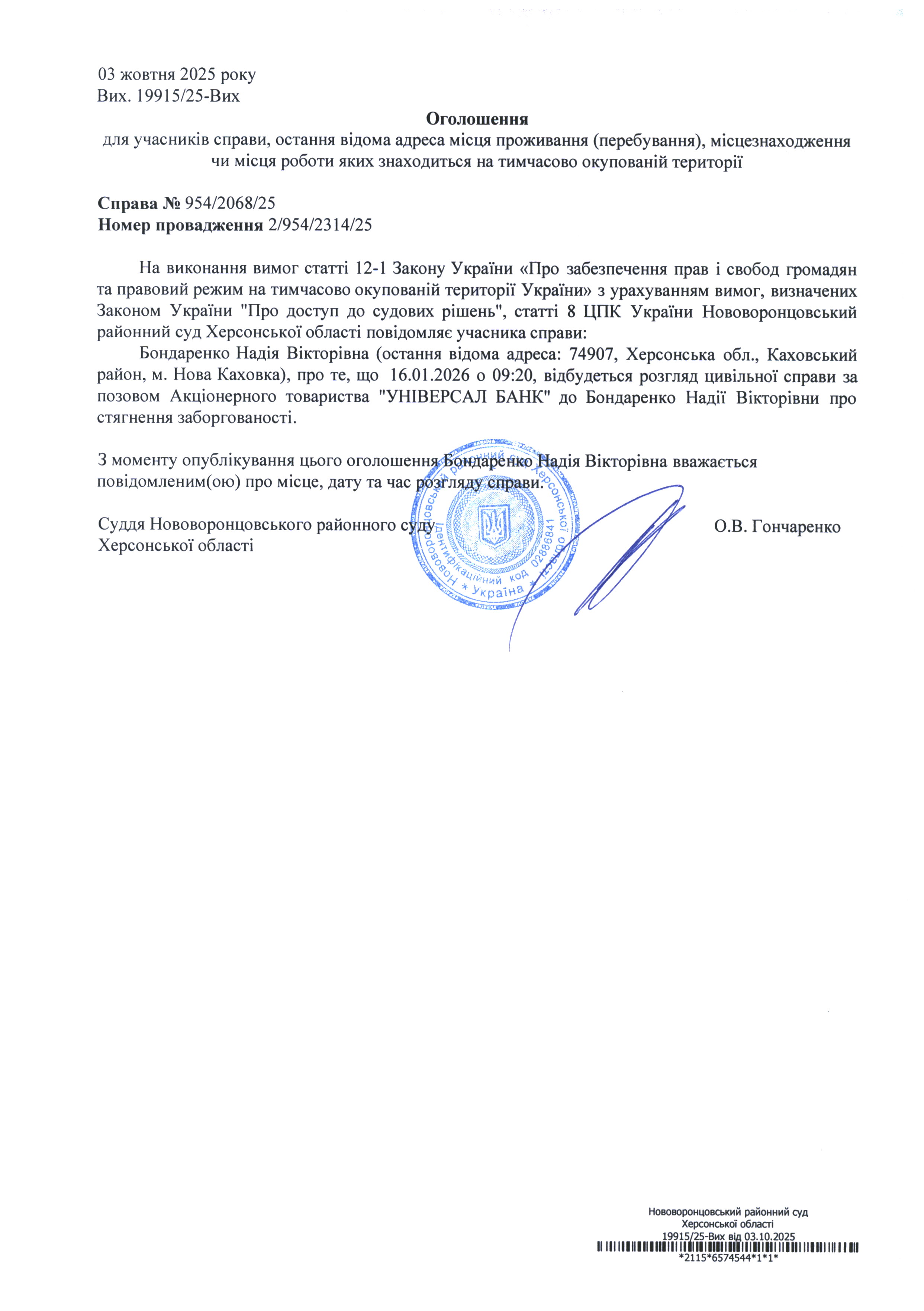 До суду викликається Бондаренко Надія Вікторівна на 9-20 16 січня 2026 року