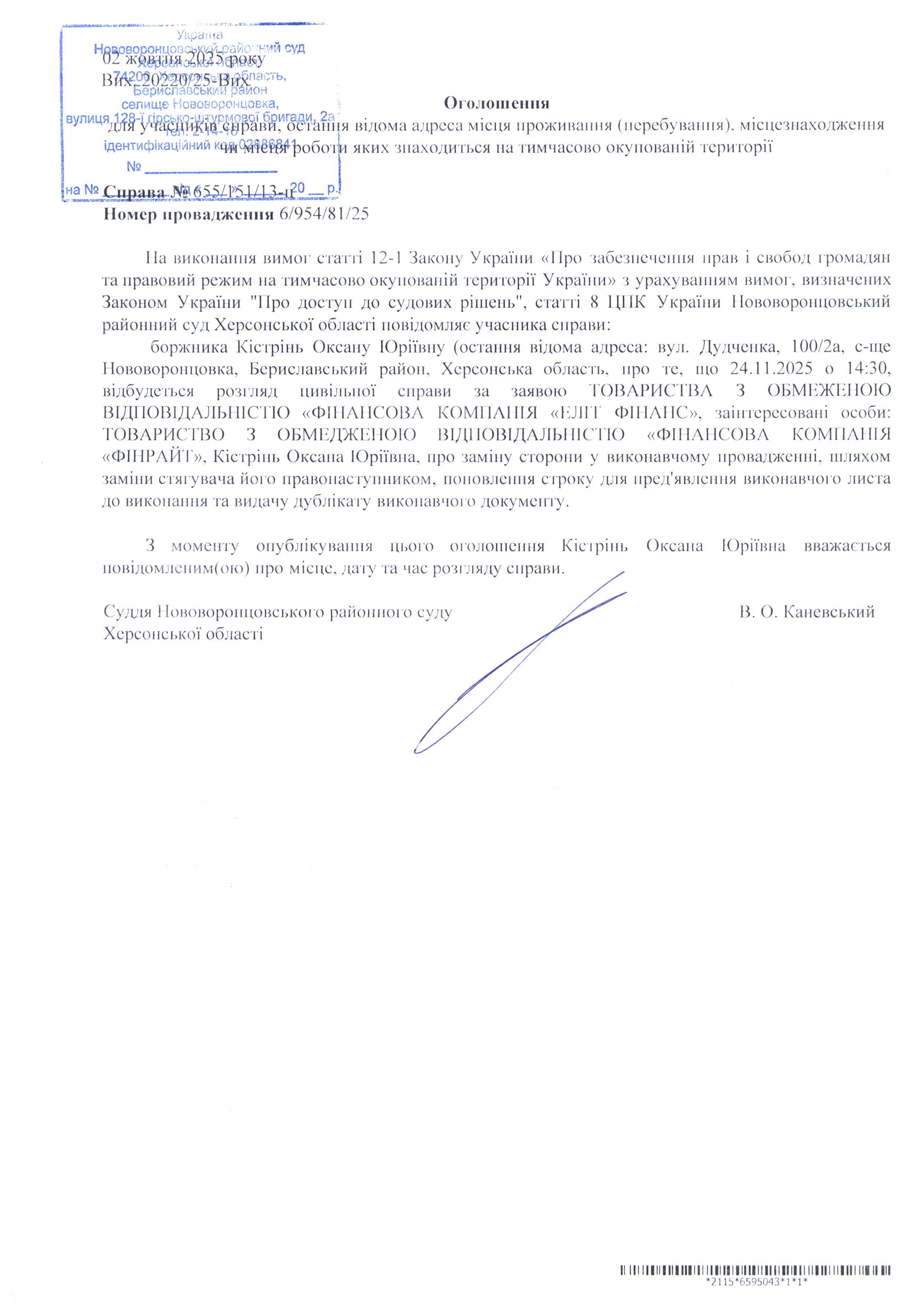 До суду викликається Кістрінь Оксана Юріївна на 14-30 24 листопада 2025 року