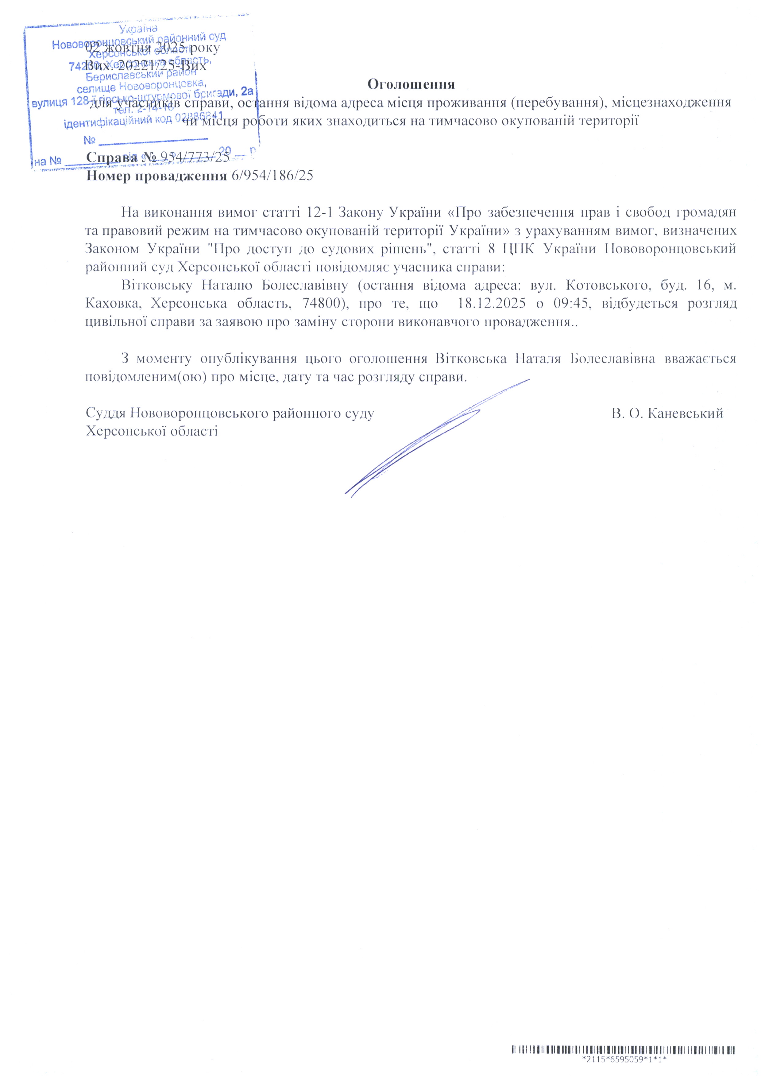 До суду викликається Вітковська Наталя Болеславівна на 9-45 18 грудня 2025 року