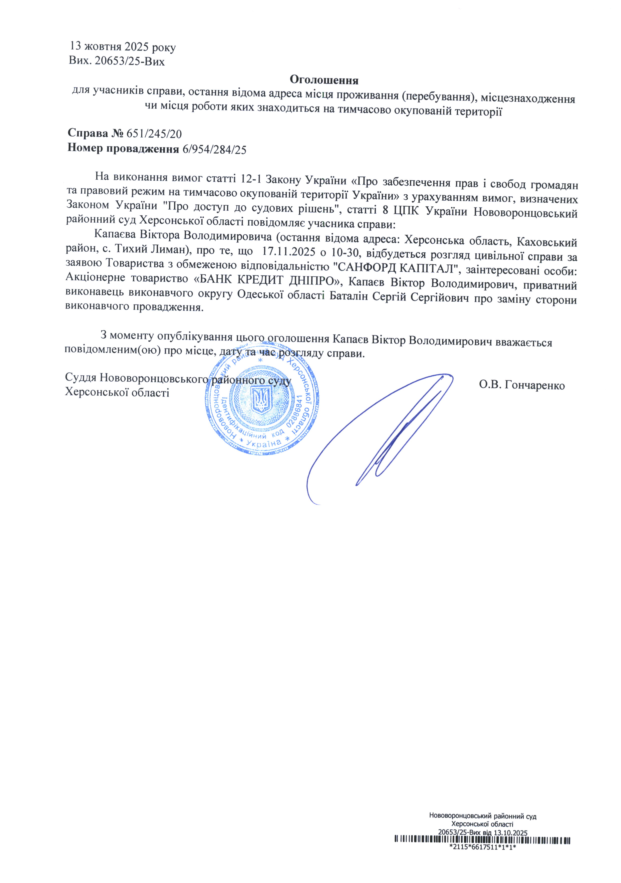 До суду викликається Капаєв Віктор Володимирович на 10-30 17 листопада 2025 року